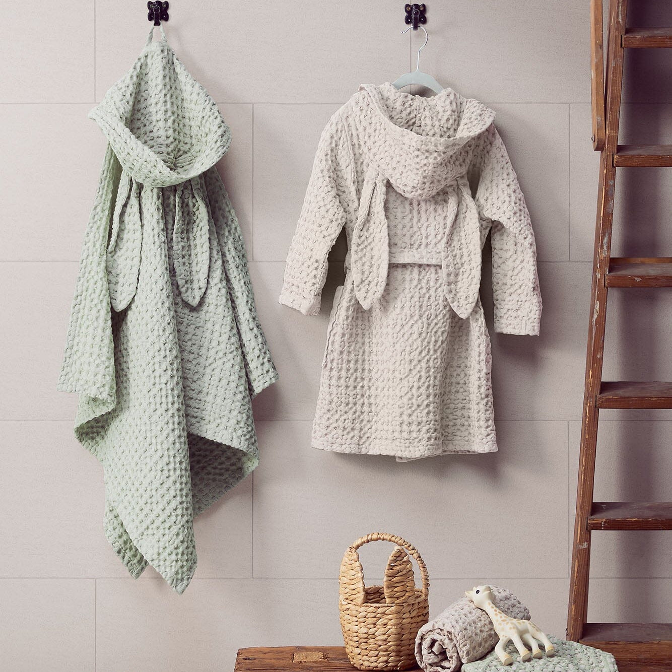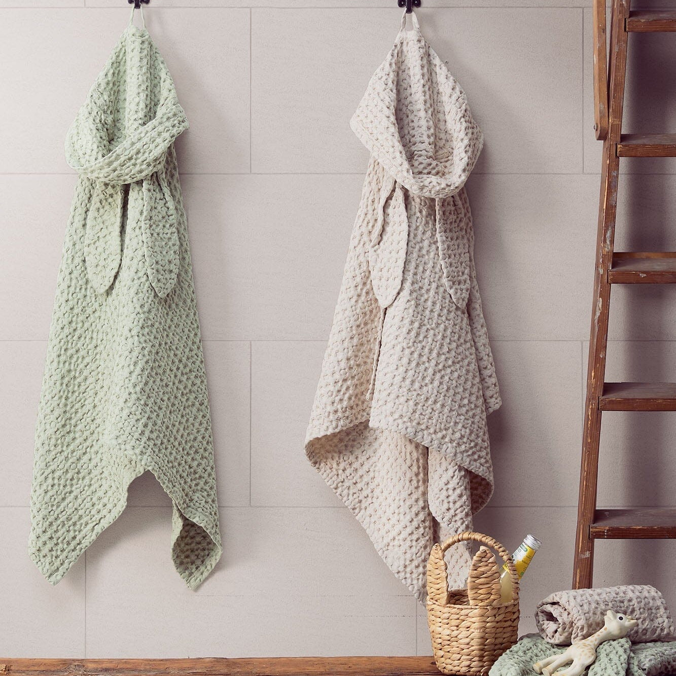 Pehmeästä vohvelikankaasta ja luomupuuvillakankaasta valmistetut kylpyhuonetekstiilit suloisilla pupunkorvilla!