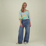 Paita on helppo yhdistää farkkuihin tai hameeseen. Paidan helma on lyhyempi, tarkistathan mittataulukon oikean koon valitsemiseksi.