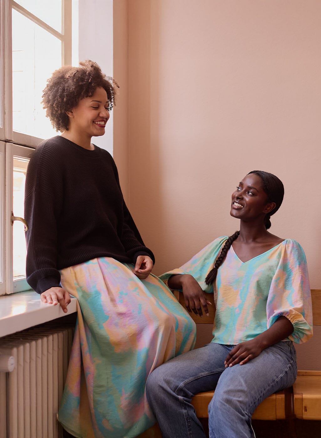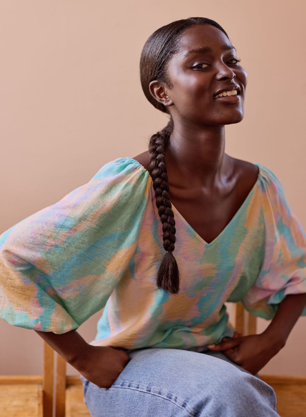 Sunset Volume Sleeve Blouse -Paita on kuin vaatekaapin taideteos. Pehmeä viskoosi tuo kuosiin upean laskeutuvuuden, ja runsaat hihat antavat ilmeelle näyttävyyttä ja keveyttä. Sunset-kuosi - Iris Maschekin maalaama abstrakti näkymä – tuo mieleen pehmeän pastellitaivaan. Tämä naisten paita on osa More Love -mallistoa, jonka ytimessä on tunne.