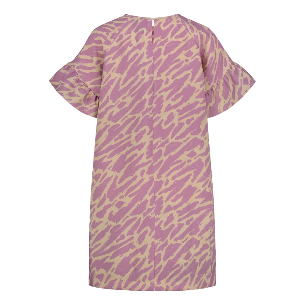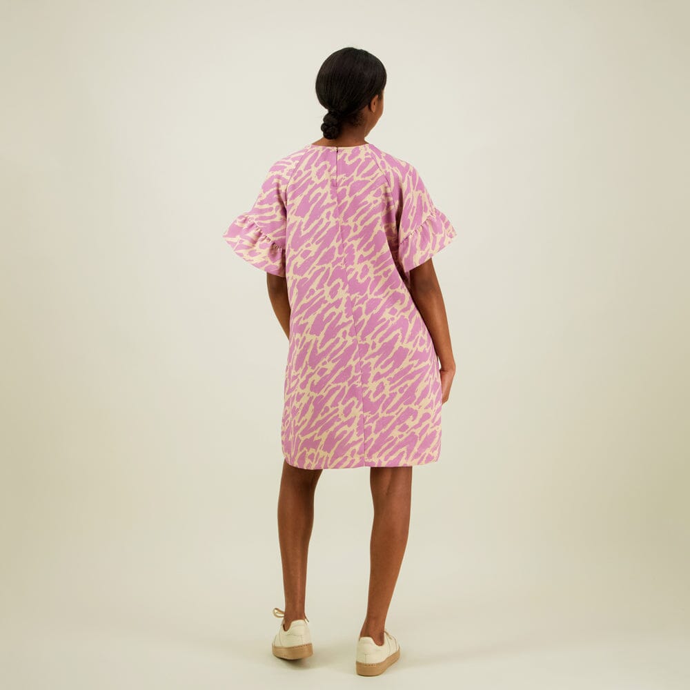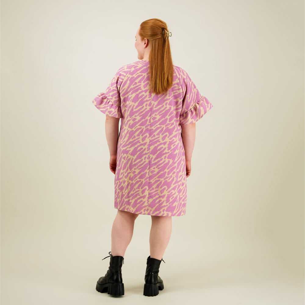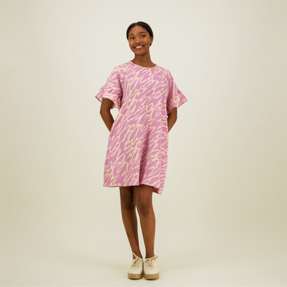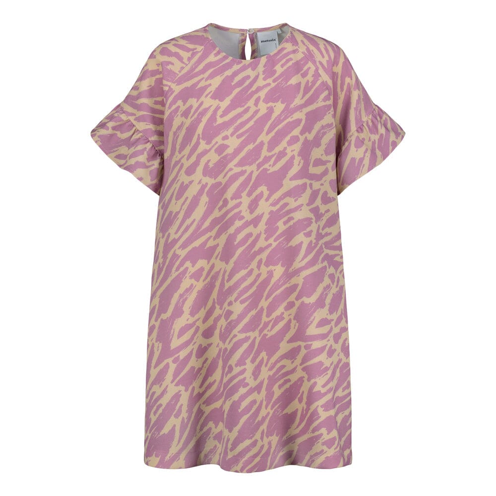 Purple-sävy yhdistettynä graafiseen kuosiin on ajaton ja helppo yhdistää sekä neutraaleihin että värikkäisiin asusteisiin. Mekossa on myös käytännölliset sivutaskut, jotka tekevät siitä sopivan sekä arkeen että juhlaan.