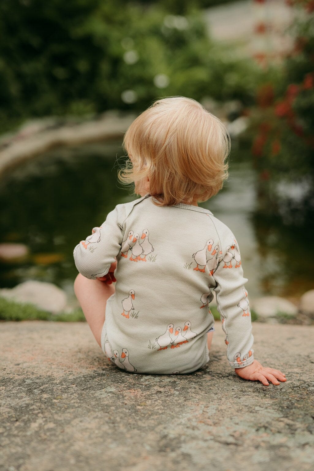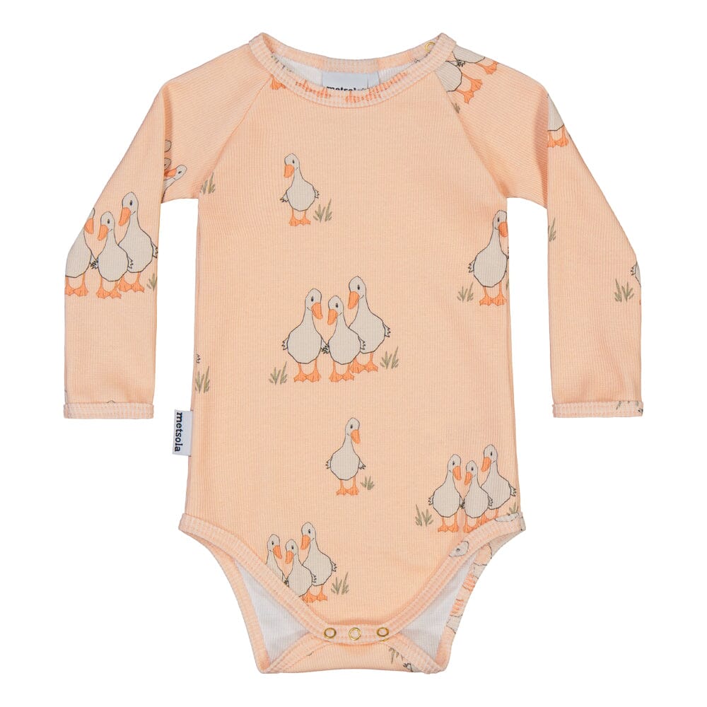 Suloisuutta ja mukavuutta vauvan jokaiseen päivään! Tiny Farmers -pitkähihaisessa vauvojen bodyssa hehkuva Milky Apricot -sävy yhdistyy hurmaavaan ankka-kuosiin, joka tuo ripauksen maalaisidylliä pienen käyttäjän asuun. Pehmeä ja joustava luomupuuvillainen rib-neulos tuntuu miellyttävältä ihoa vasten ja mukautuu vauvan liikkeisiin. Käytännölliset nepparit olalla ja haaroissa tekevät pukemisesta helppoa.