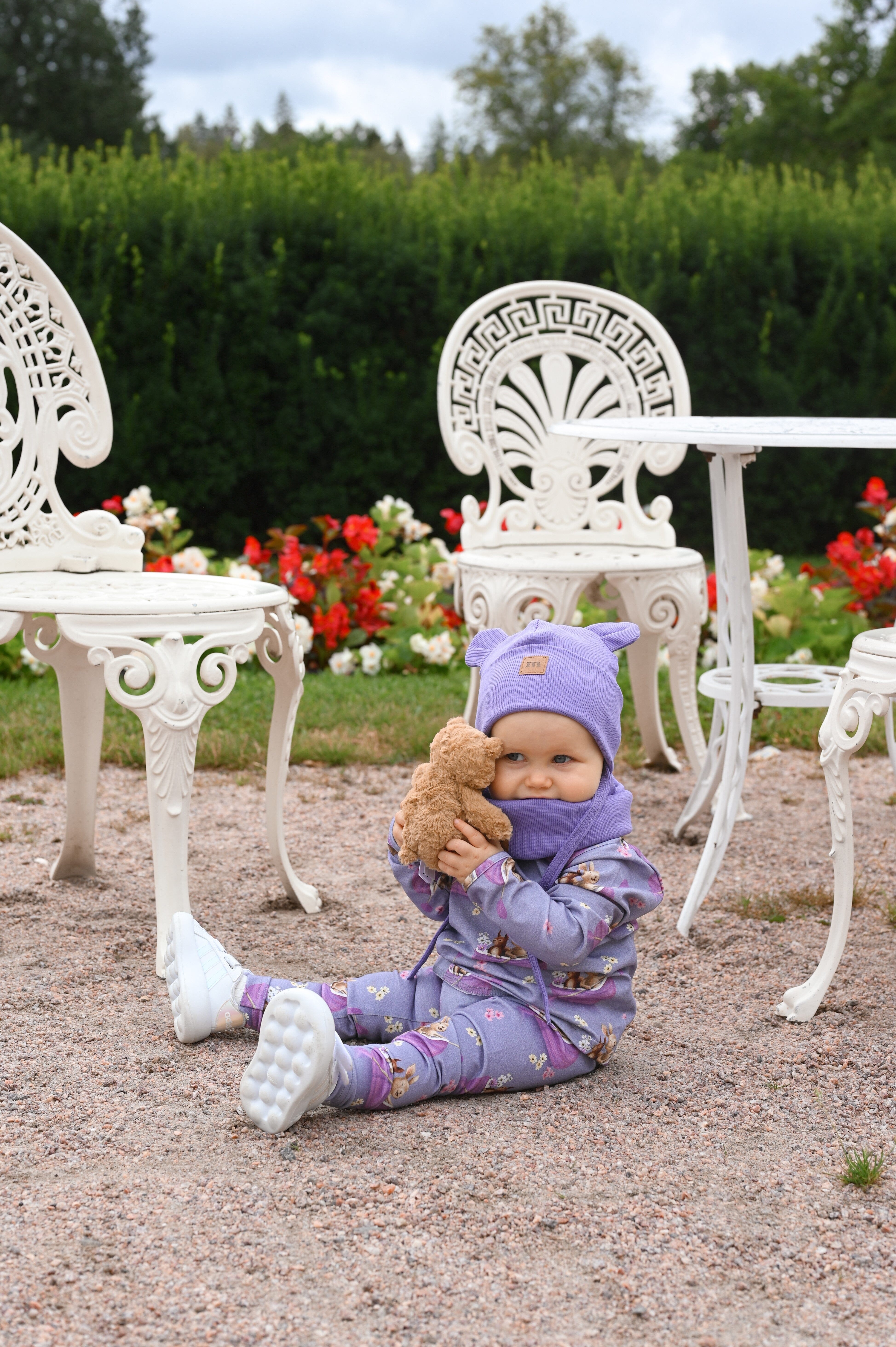 Pipossa on söpöt nallenkorvat sekä kiristysnyörit, jotka varmistavat, että pipo pysyy hyvin paikoillaan myös liikkeessä. Joustava rib-neulos takaa hyvän istuvuuden ilman puristusta.