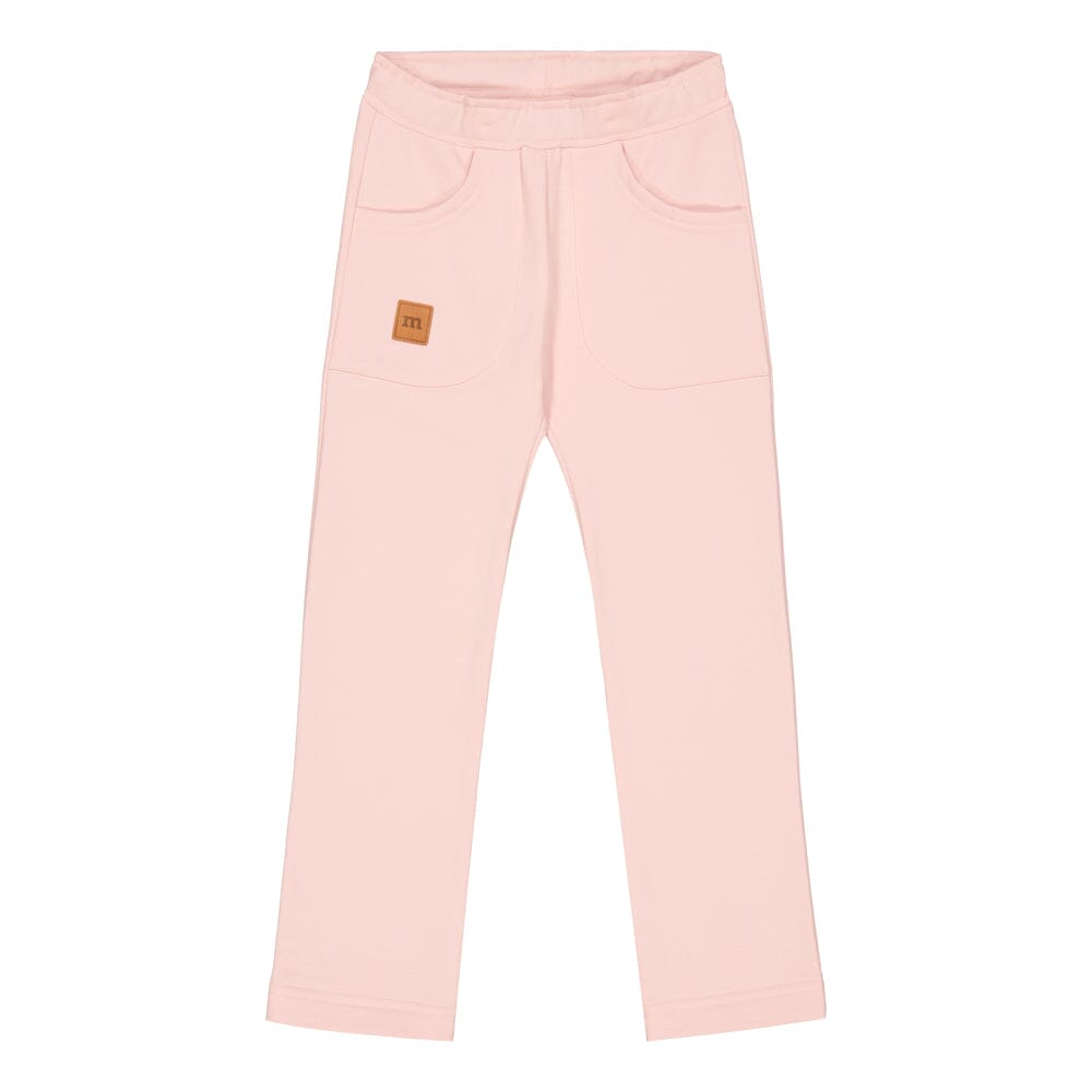 Lasten korkealaatuiset college housut on valmistettu erittäin kestävästä ja joustavasta luomupuuvillasta. Collegehousuissa on vyötäröllä kuminauha ja edessä taskut, joissa nahkajäljitelmää oleva merkki. Näissä lasten housuissa on suorat lahkeet ja suloisen herkkä vaaleanpunaisen sävy.