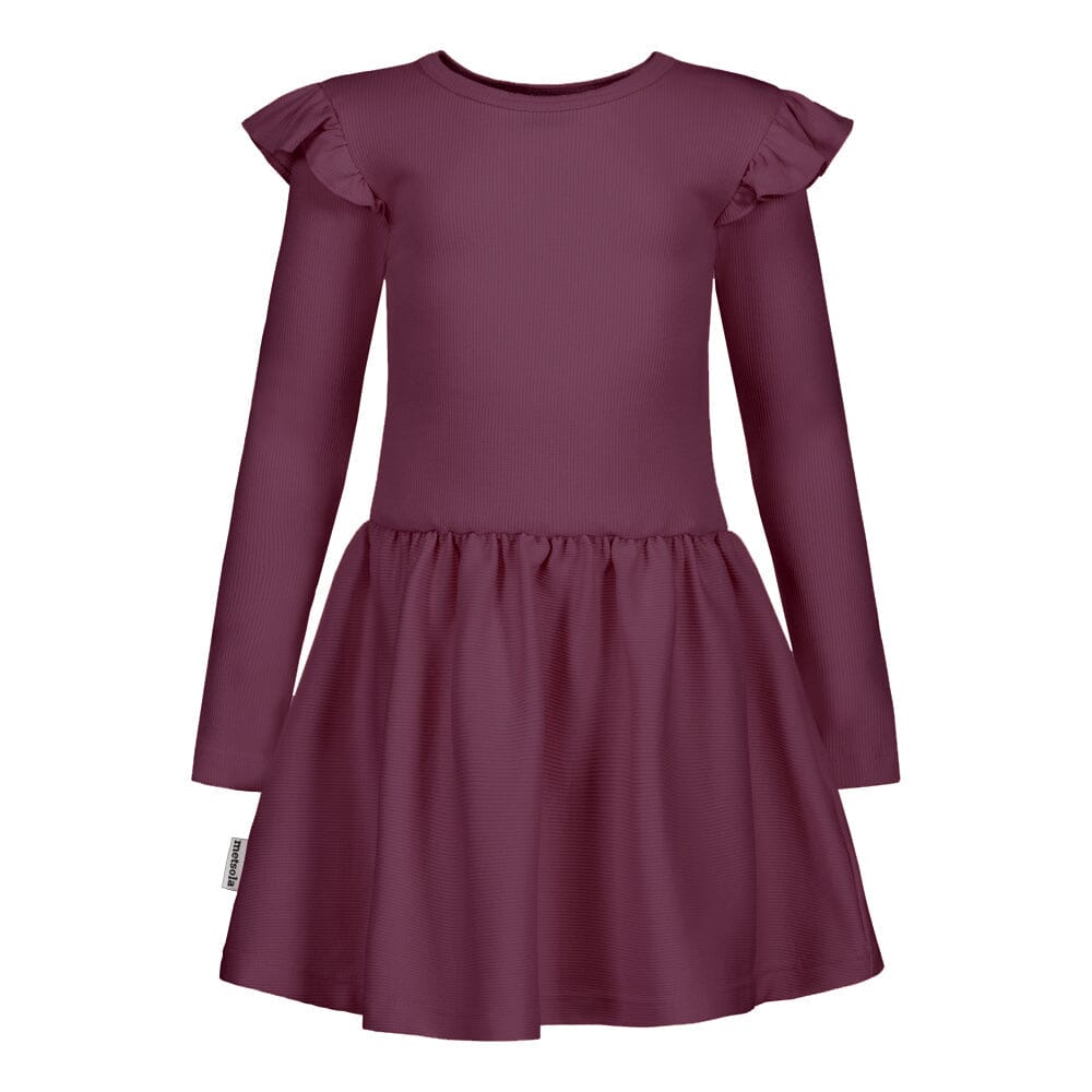Rib Frilla -mekko Berry on tyylikäs ja pehmoinen ribbineuloksesta valmistettu lasten mekko, joka hurmaa syvän punavioletilla sävyllään. Berry on lämmin ja kaunis väri, joka tuo syksyyn ja talveen ripauksen hillittyä eleganssia – täydellinen osa Metsolan Urban Story -mallistoa.