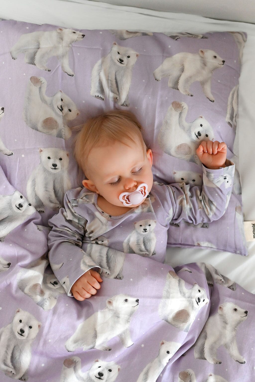 Polar Bears -Pyjama väri Icy Lilac kutsuu pienet uneksijat satumaiseen talviyöhön. Tässä pehmeästä luomupuuvillasta valmistetussa pyjamassa seikkailevat suloiset jääkarhunpoikaset Henna Adelin taiteilemassa kuosissa, joka huokuu rauhaa ja leikkisyyttä.