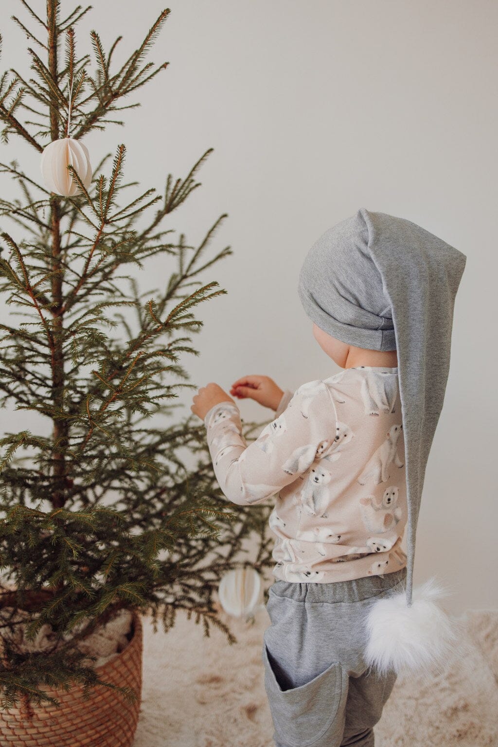 Kuvan malli (poika) on 102cm pitkä ja hänen yllään on koko 98/104. Tonttulakki kokoa 5-6y. Kokotaulukon mitat ovat suuntaa antavia. Mitat ovat +/- 1cm tarkkuudella.