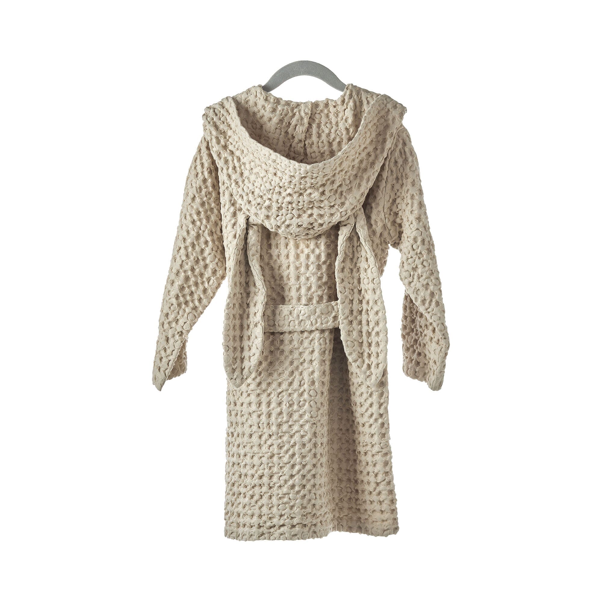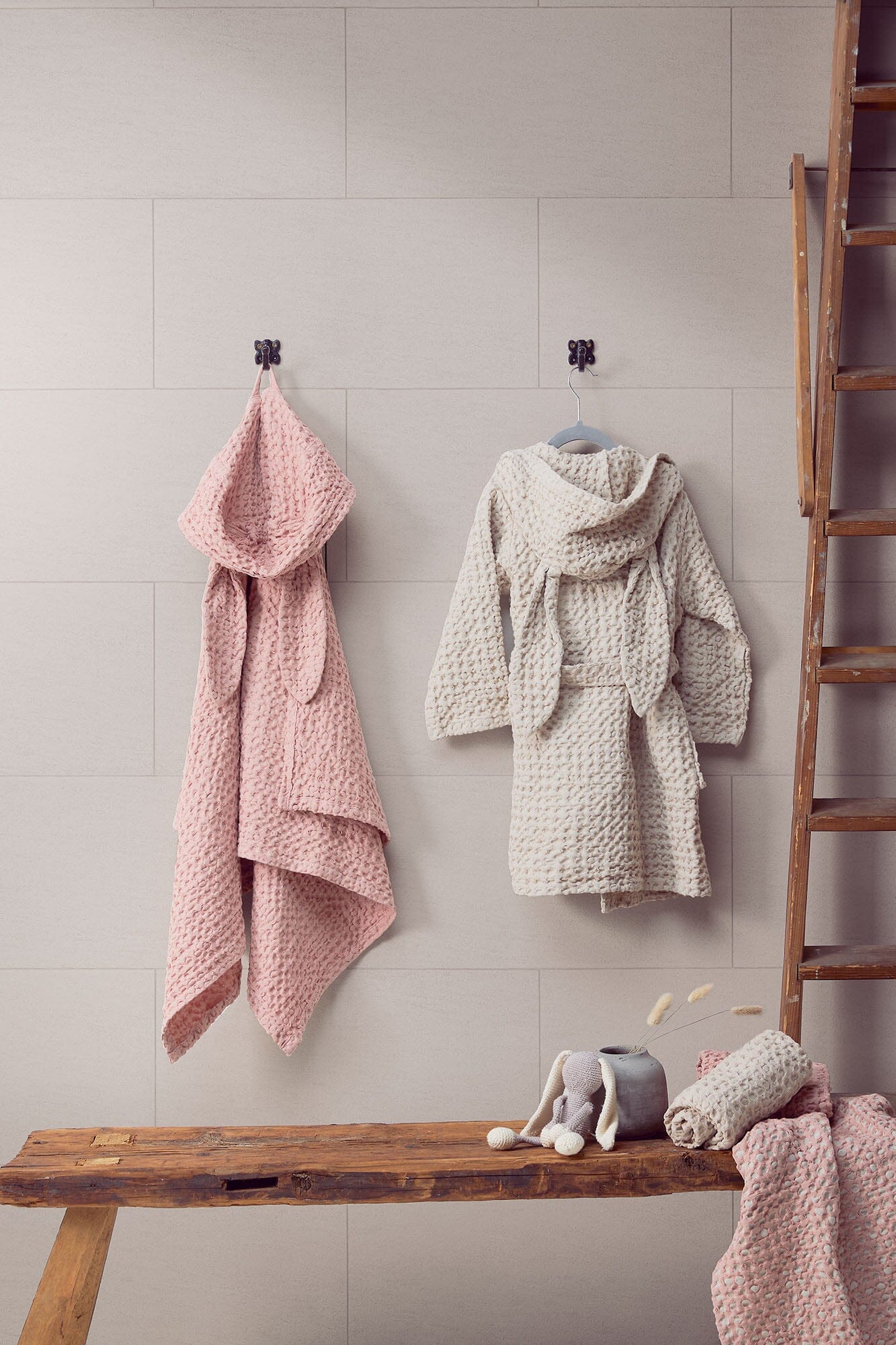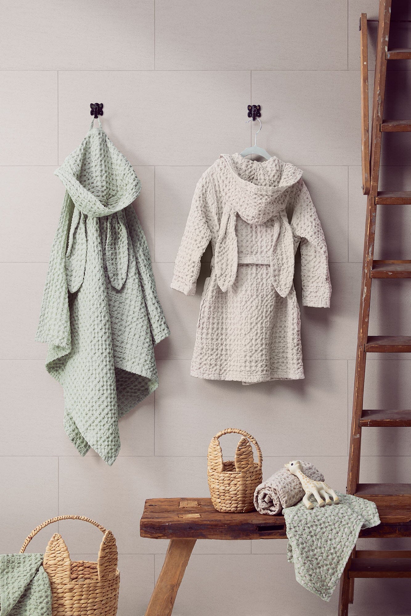 Suloista lasten kylpytakkia koristaa huppu, jossa on pitkät pupunkorvat. Pupu-kylpytakki on pestystä luomupuuvillaisesta vohvelikankaasta valmistettu ja se on kevyen ja mukavan tuntuinen ihoa vasten.