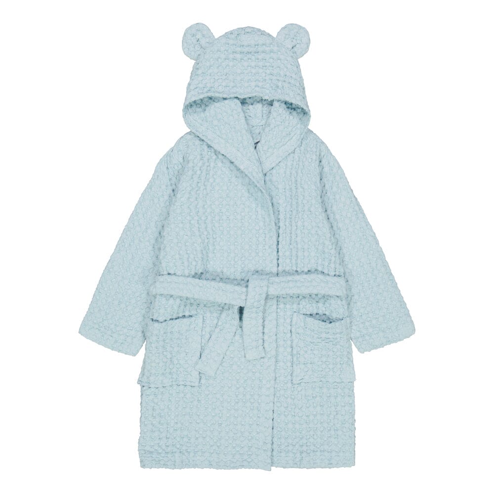Teddy -Lasten kylpytakki väri Icy Blue kietoo pienet käyttäjänsä pehmeään lämpöön kylvyn, saunan tai uneliaan aamun jälkeen. Hupussa on suloiset karhunkorvat, jotka tuovat ripauksen leikkiä ja Metsola-tunnelmaa kylpyhetkiin.
