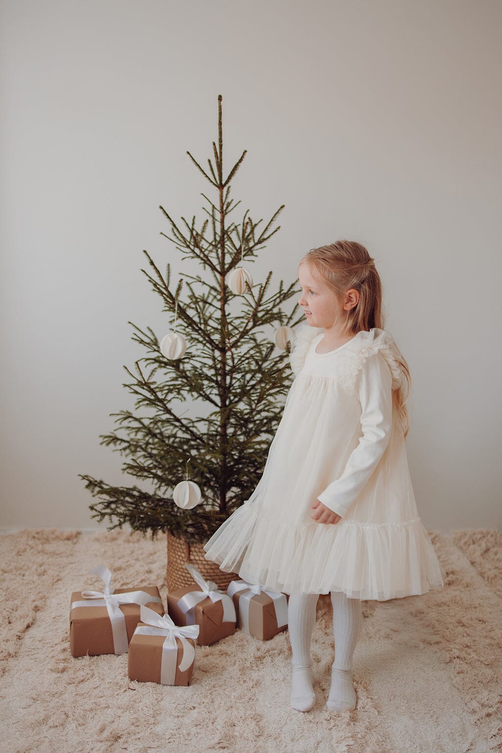 Mekon pohjakangas on luomupuuvillainen rib, joka tuntuu pehmeältä ihoa vasten ja joustaa liikkeessä. Tämä lasten juhlamekko on täydellinen valinta joulun juhlapäiviin, talven syntymäpäiväjuhliin tai muihin erityisiin hetkiin. Tyllimekko lapselle, joka rakastaa kepeyttä ja kauneutta ❤