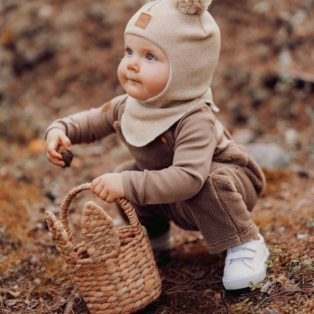 Suomessa valmistettu, merinovillainen kahden tupsun kypärämyssy pitää pikkuisesi lämpimänä säällä kuin säällä.