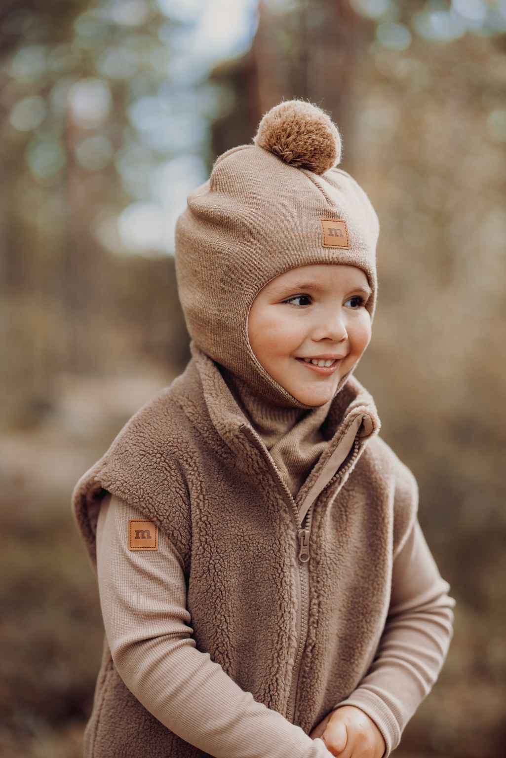 Suomessa valmistettu merinovilla-kypärämyssy lankatupsulla pitää pikkuisesi lämpimänä.