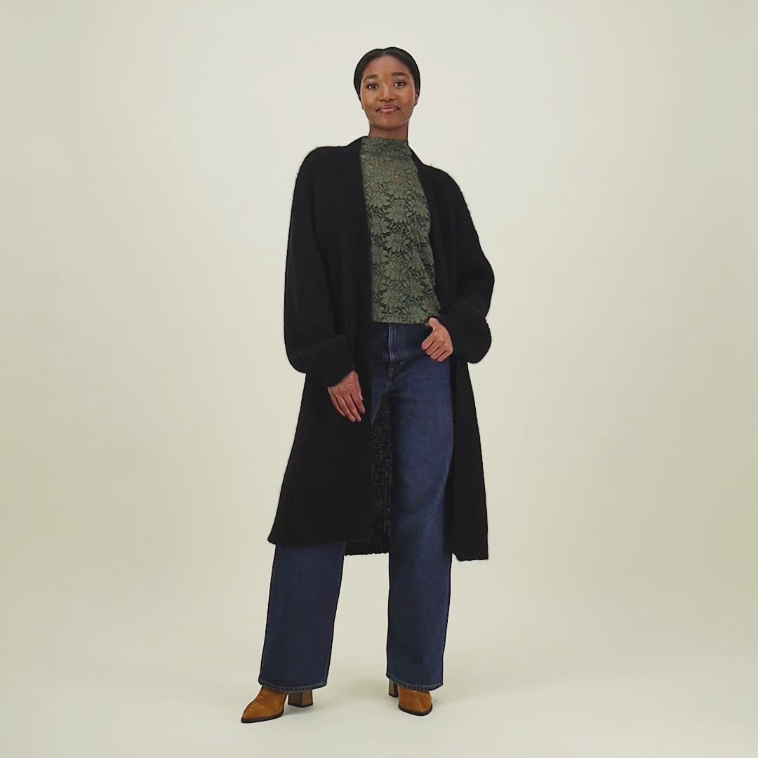 Syvä musta Licorice -sävy on klassinen ja voimakas sävy, joka tuo asuun ryhtiä ja kontrastia. Pitkä malli laskeutuu kauniisti ja luo kevyen, mutta näyttävän siluetin. Neuletakin avoin leikkaus ja rento istuvuus tekevät siitä täydellisen kerrostusvaatteen – heitä ylle mekon, housujen tai kotiasun päälle tuomaan lämpöä ja tyyliä.