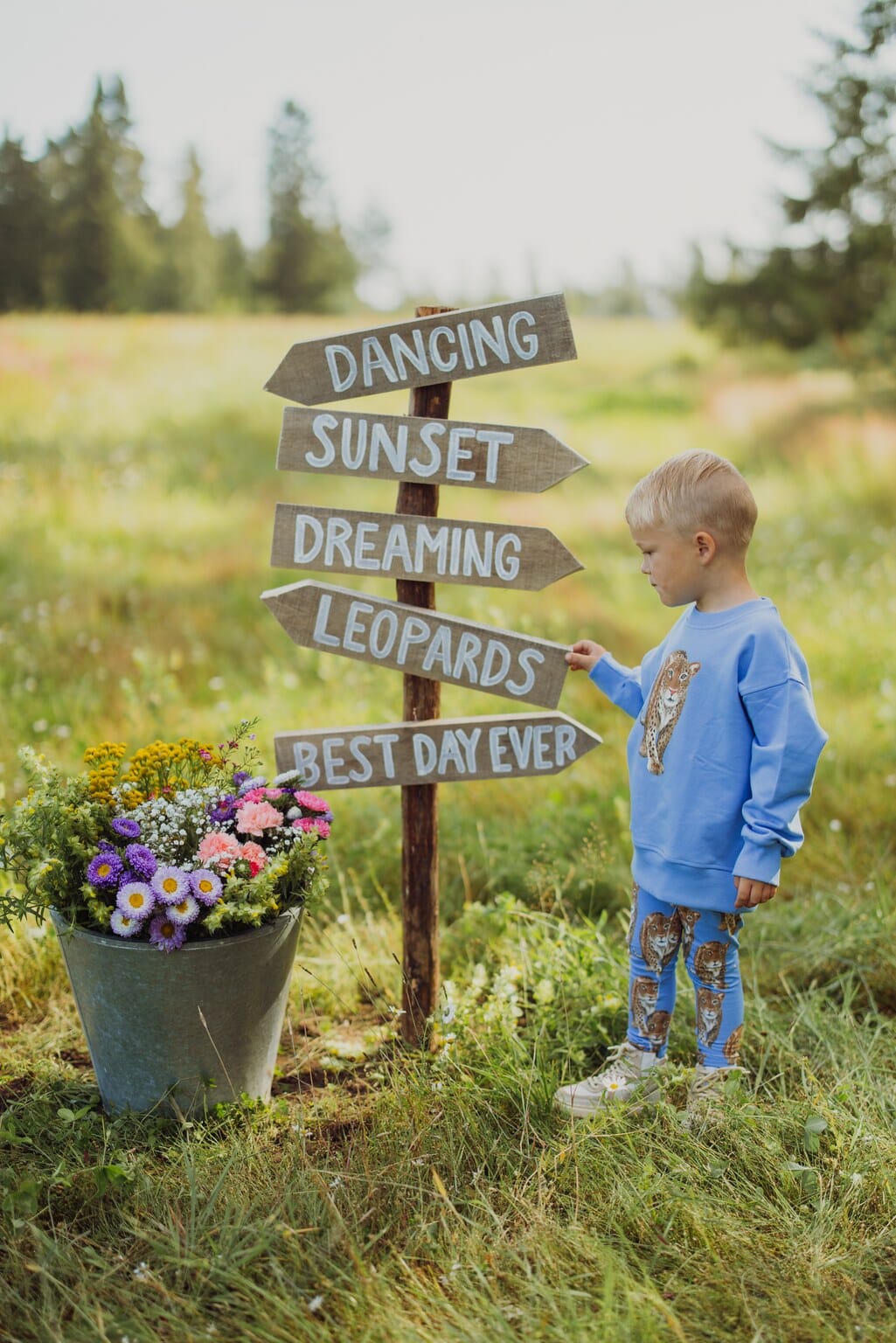 Tämä lasten oversize sweater -collegepaita hurmaa kaikki! Kauniin sinisessä collegepaidassa ihastuttaa etupuolelle painettu leopardi - sisältä ihanan pehmeää harjattua collegea.