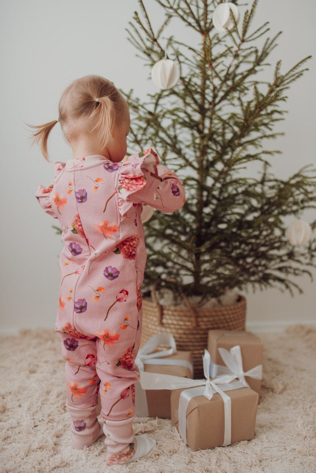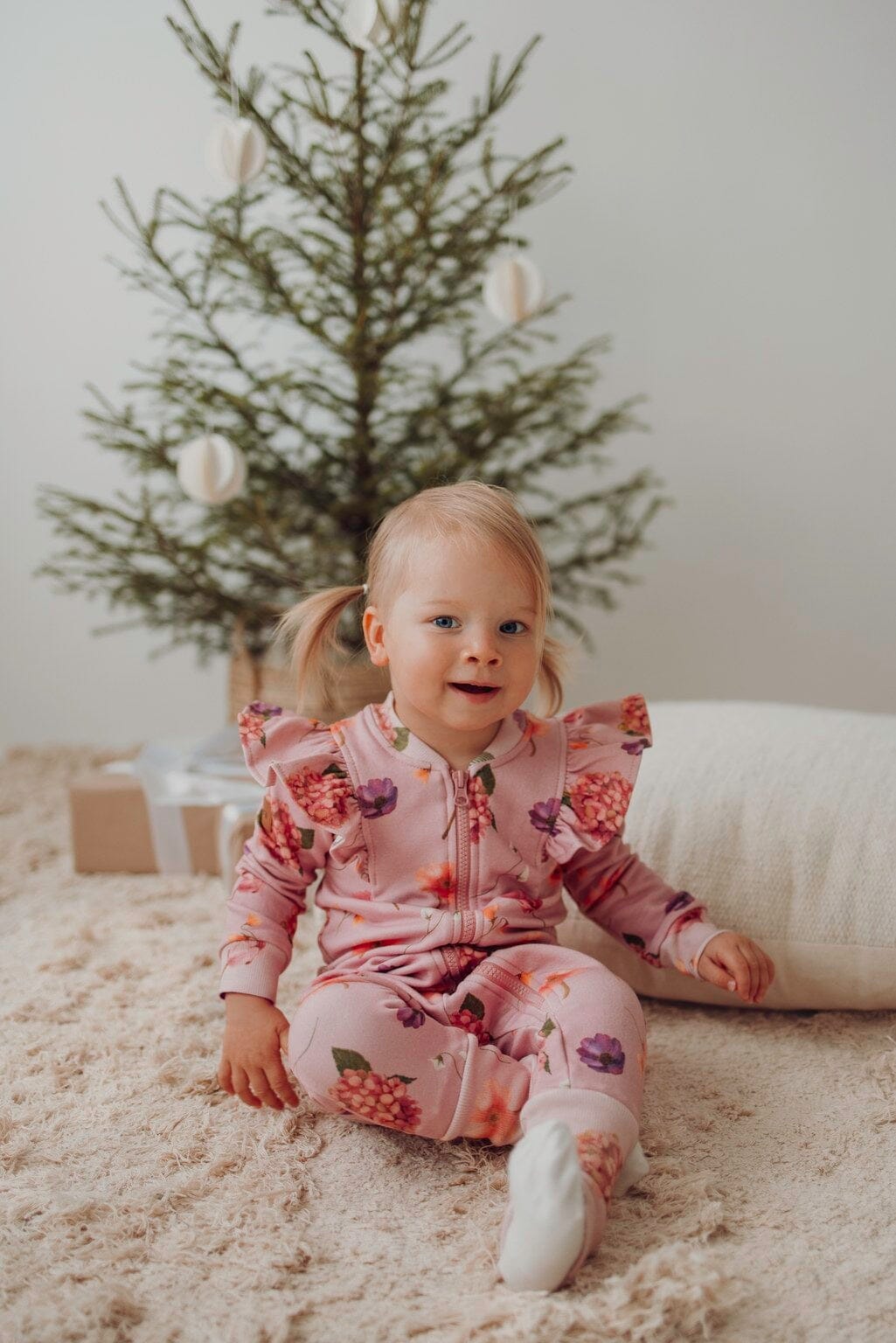 Whispers Frill -Jumpsuit värissä Rosy on hurmaava vauvan juhlahaalari, joka yhdistää pehmeyden, käytännöllisyyden ja juhlavan ilmeen. Henna Adelin suunnittelema Whispers-kuosi kukkii kauniisti hennon roosalla pohjalla ja tuo asuun tyttömäistä herkkyyttä.