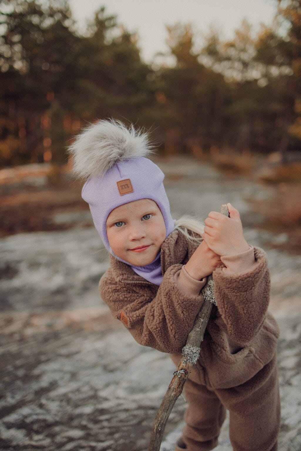 Fur Pom Pom -kypärämyssy Icy Lilac on Suomessa valmistettu merinovillainen kypärämyssy, joka pitää pienokaisen pään ja kaulan lämpimänä myös talven kylmimpinä päivinä. Raikas vaaleanlilan sävy tuo asuun pehmeyttä ja modernia pastellia – täydellinen valinta, kun haluat yhdistää suloisuuden ja toimivuuden.