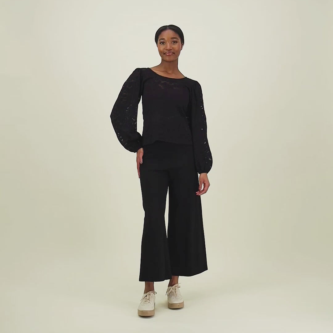 Naisten mustat, leveälahkeiset culottes housut, ovat ajattomat ja helposti erilaisiin asukokonaisuuksiin yhdistettävät. Korkeavyötäröiset culottes-housut on valmistettu napakasta trikoosta joka on materiaalina mukavan joustavaa mutta kestävää. Housuissa ei ole taskuja ja vyötärökaitale on korkea, joten sen voi pitää suorana tai halutessaan kääntää alas.