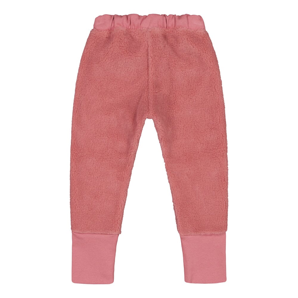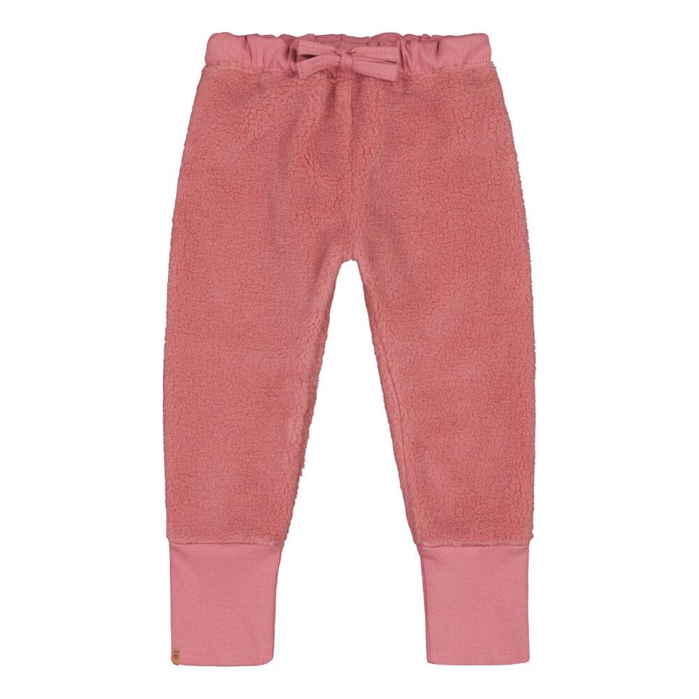 Housut on valmistettu superpehmeästä pääasiallisesti kierrätyskuidusta valmistetusta teddy-kankaasta, joka tuntuu miellyttävältä päällä ja tuo asuun lämpimän, leikkisän ilmeen. Vyötäröllä on säädettävä kiristysnyöri, joka takaa hyvän istuvuuden ja tekee housuista mukavat monen kokoisille lapsille. Lahkeissa on leveät käännettävät resorit, joiden ansiosta housut kasvavat lapsen mukana ja istuvat kauniisti.