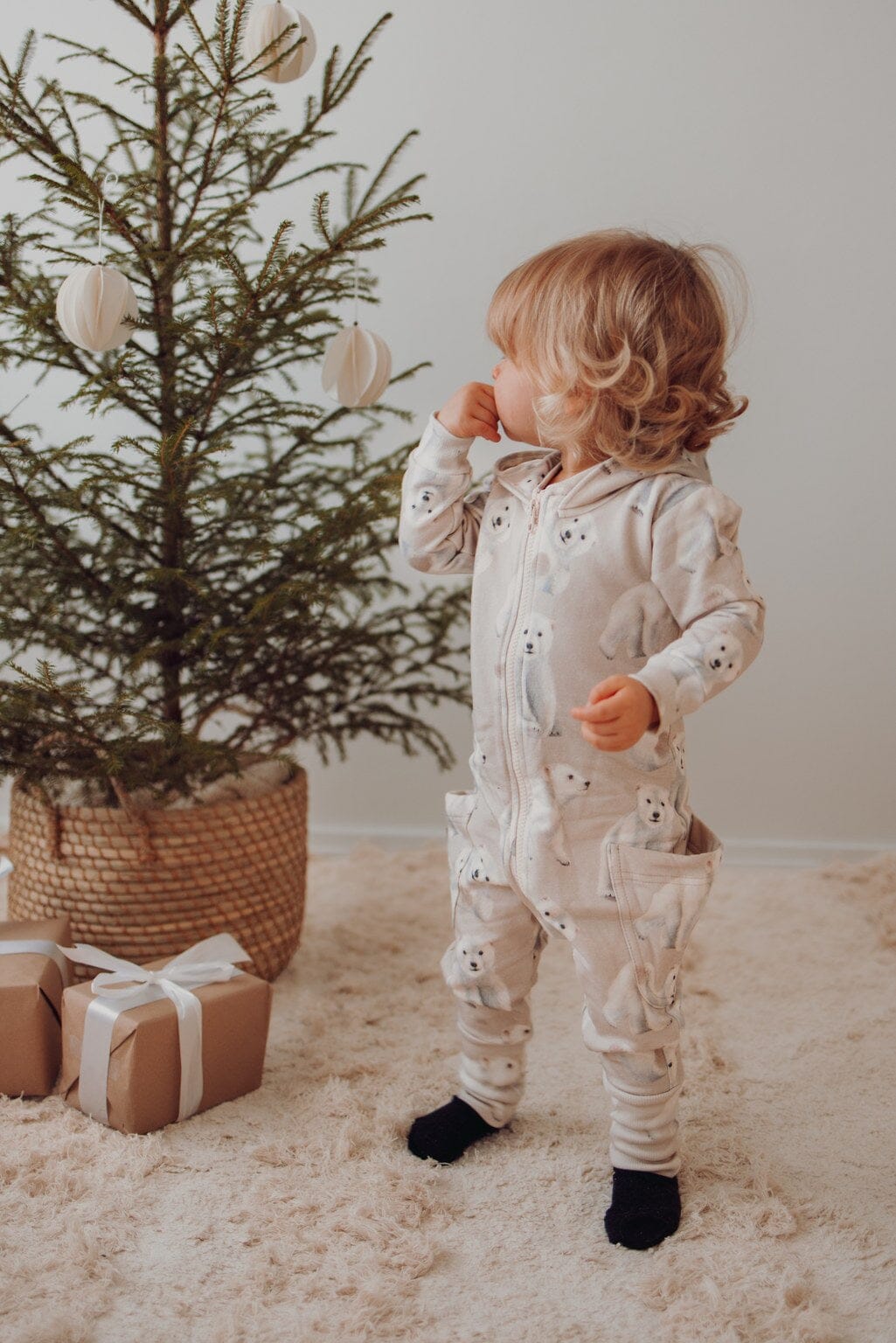 Polar Bears Jumpsuit värissä Sand on hurmaava vauvan haalariasu jossa yhdistyvät talvisen kuosin satumaisuus ja käytännön arjen vaivattomuus. Haalari on valmistettu pehmeästä luomupuuvillacollegesta, joka tuntuu miellyttävältä vauvan ihoa vasten ja mukautuu hyvin liikkeeseen. Henna Adelin suunnittelema Polar Bears -kuosi tuo vaatteeseen rauhallisen ja leikkisän tunnelman - vaalean hiekan sävyllä kuvioidut jääkarhunpennut tekevät asusta erityisen suloisen.
