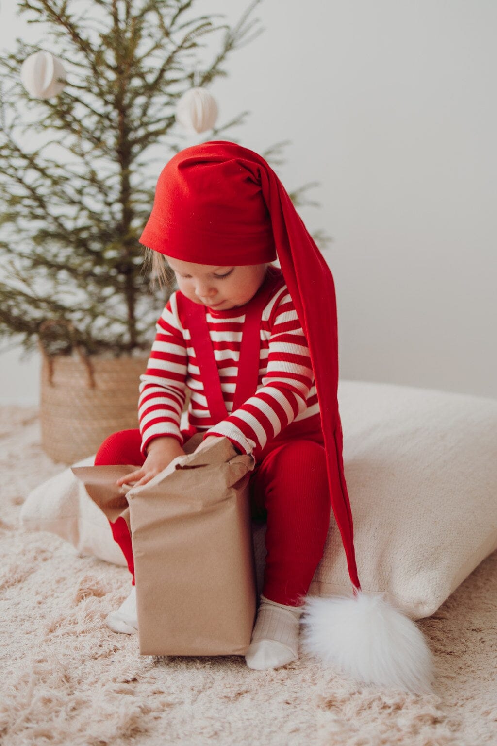 Kuvan malli on 82cm pitkä ja hänen yllään on koko 86/92. Tonttulakki kokoa 1-2y. Kokotaulukon mitat ovat suuntaa antavia. Mitat ovat +/- 1cm tarkkuudella.