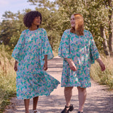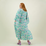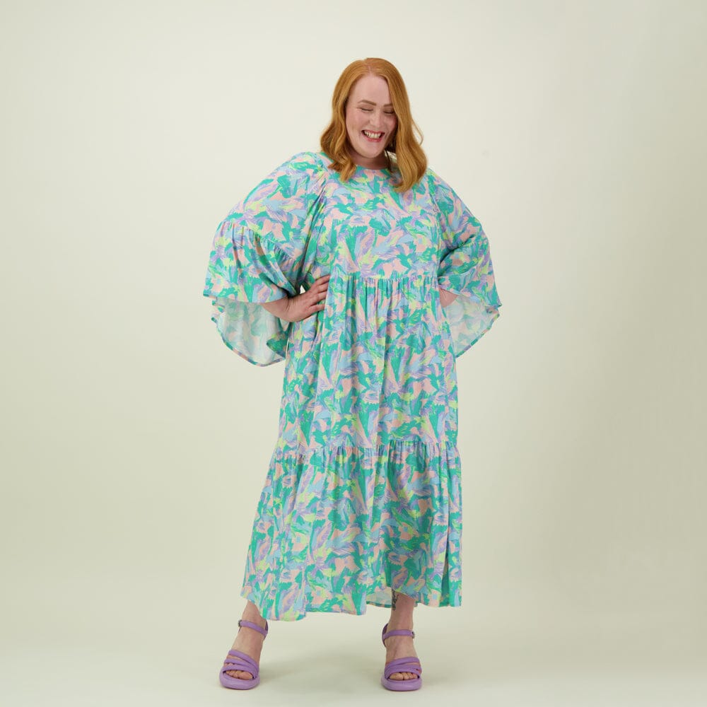 Bell Sleeve Midi Dress hurmaa upealla Dream-kuosilla, jossa 90-luvun inspiroima, puuväreillä kuvitettu taideteos yhdistyy pehmeisiin pastellisävyihin ja moderniin ilmeeseen. Tämä midimittainen mekko on yhtä aikaa näyttävä ja ajaton – täydellinen valinta niin arkeen kuin juhlaan.