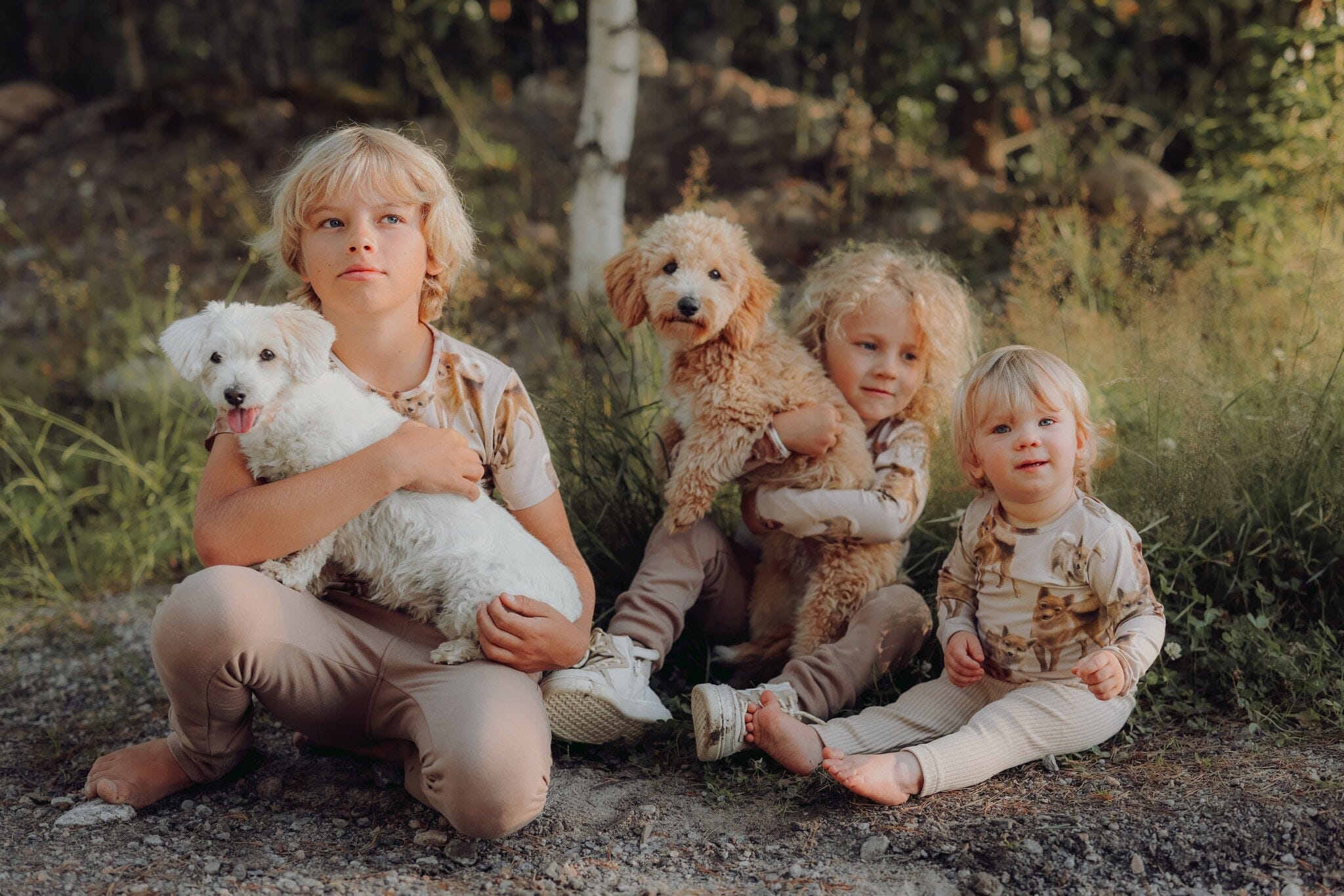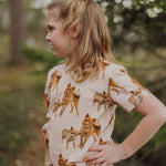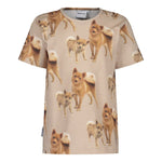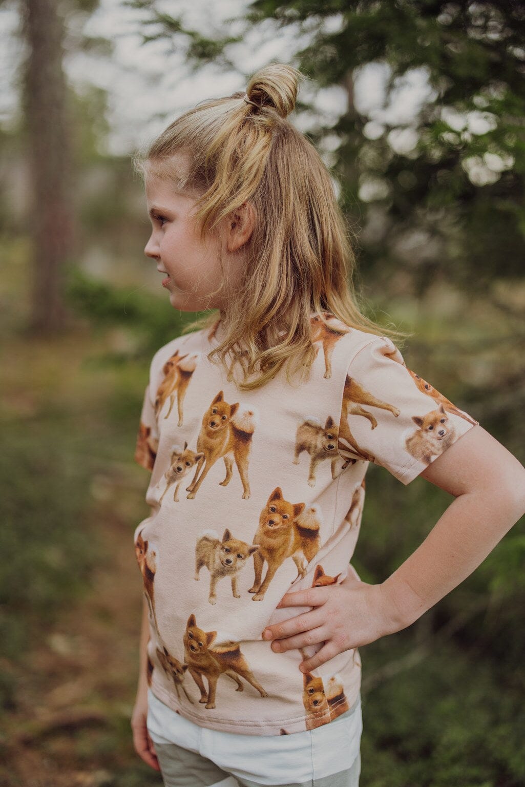 Suloisen Doggies -t-paidan kuosissa seikkailevat Henna Adelin suunnittelemat koirat, jotka tuovat asuun iloa ja leikkisyyttä. Neutraalin Moonlight-sävyinen pohja luo tyylikkään kontrastin ilmeikkäille koirahahmoille, tehden lasten paidasta yhtä aikaa hurmaavan ja ajattoman.