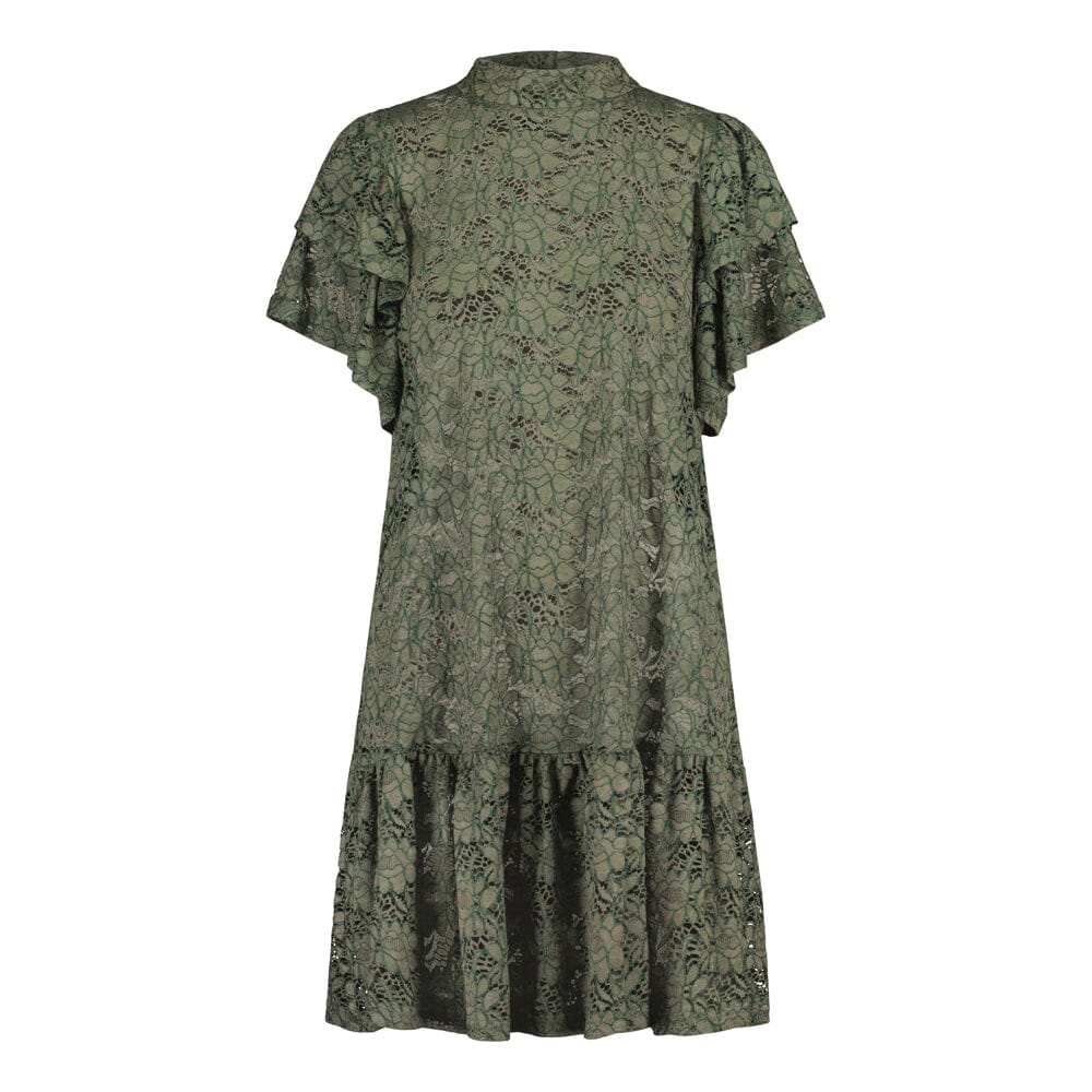 tuotekuva jossa naisten lyhyt vihreä pitsimekko frillahihoilla ja korkealla kauluksella, läpikuultava ilman aluspaitaa.