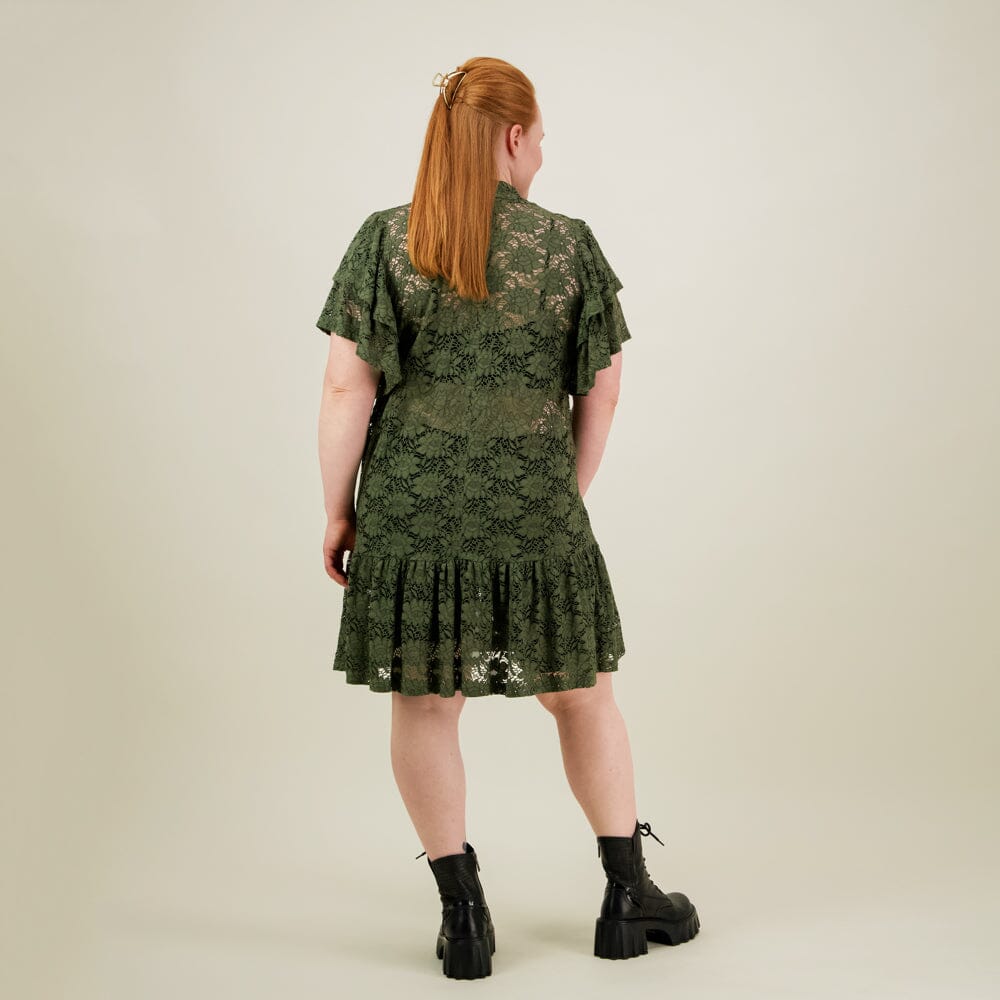 malli takaa päin jolla yllään naisten lyhyt vihreä pitsimekko frillahihoilla ja korkealla kauluksella, läpikuultava ilman aluspaitaa.