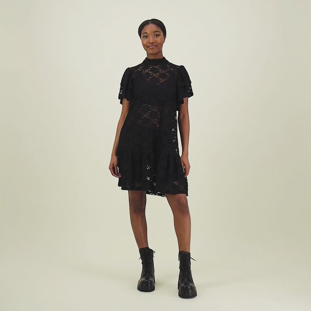 Mekko on valmistettu läpikuultavasta pitsistä, eikä siinä ole aluspaitaa. Pue alle bikershortsit, ohut alushame tai leikittele kontrasteilla – kerrostaminen on osa tämän mekon luonnetta. Lyhyt helma ja kerrostetut hihat tekevät kokonaisuudesta kevyen ja ilmeikkään, kun taas korkea kaulus tasapainottaa siluetin tuoden siihen ripauksen klassisuutta.