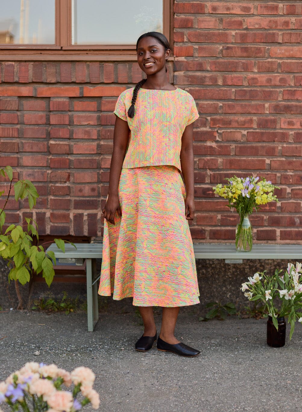 Jacquard Circle Skirt -kellohame on elegantti ja ajaton hame, jossa kauniisti laskeutuva kellomainen siluetti tuo asuun liikettä ja näyttävyyttä. Strukturoitu jacquard-kangas antaa hameelle ryhtiä ja viimeistellyn ilmeen.