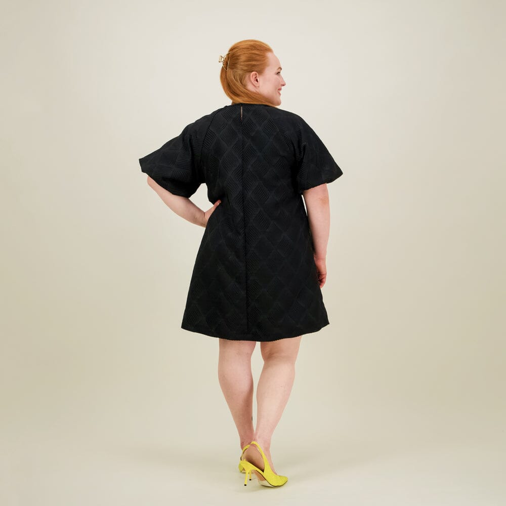 Mekko on valmistettu ylellisestä jacquard-kankaasta, jonka klassinen musta sävy tuo kauniisti esiin kankaan struktuurin ja antaa mekolle juhlavan, ryhdikkään ilmeen. Lyhyet puhvihihat tuovat kokonaisuuteen keveyttä ja pehmeyttä, kun taas lyhyt helma tekee siluetista raikkaan ja modernin.
