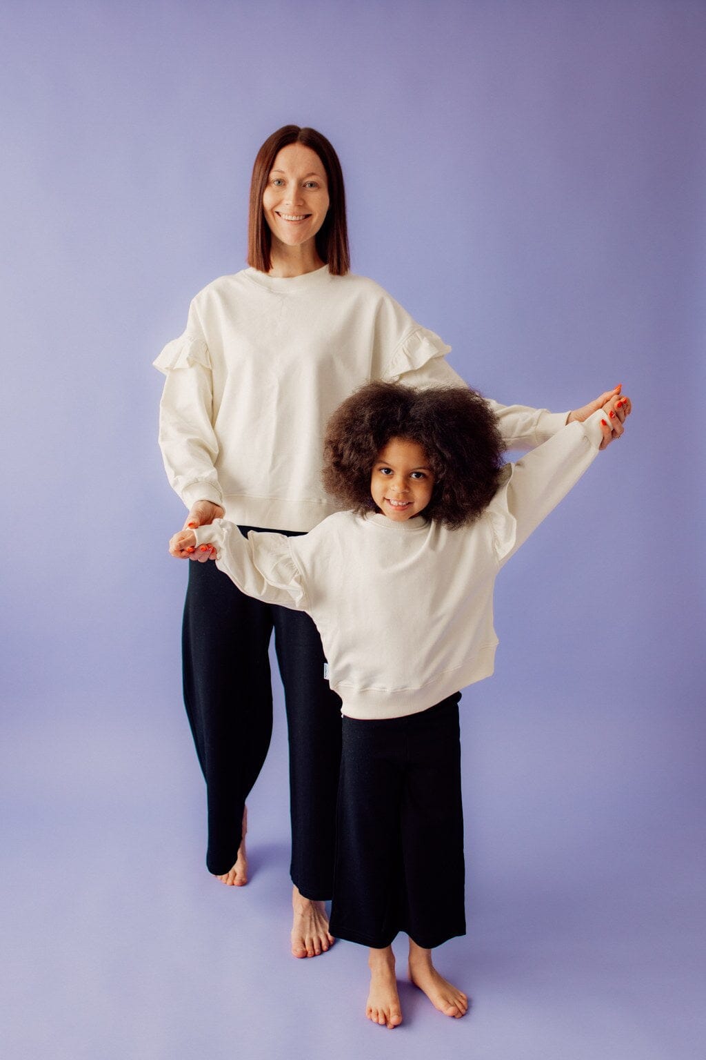 Korkea vyötärökaitale tuntuu miellyttävältä päällä ja mahdollistaa housujen käytön joko suorana tai alas käännettynä. Taskuttomuus tekee housuista siistit ja helposti yhdisteltävät niin arkeen kuin siistimpäänkin menoon – ja mikä parasta, housut löytyvät myös naisten mallistosta, joten voitte samistella yhdessä!