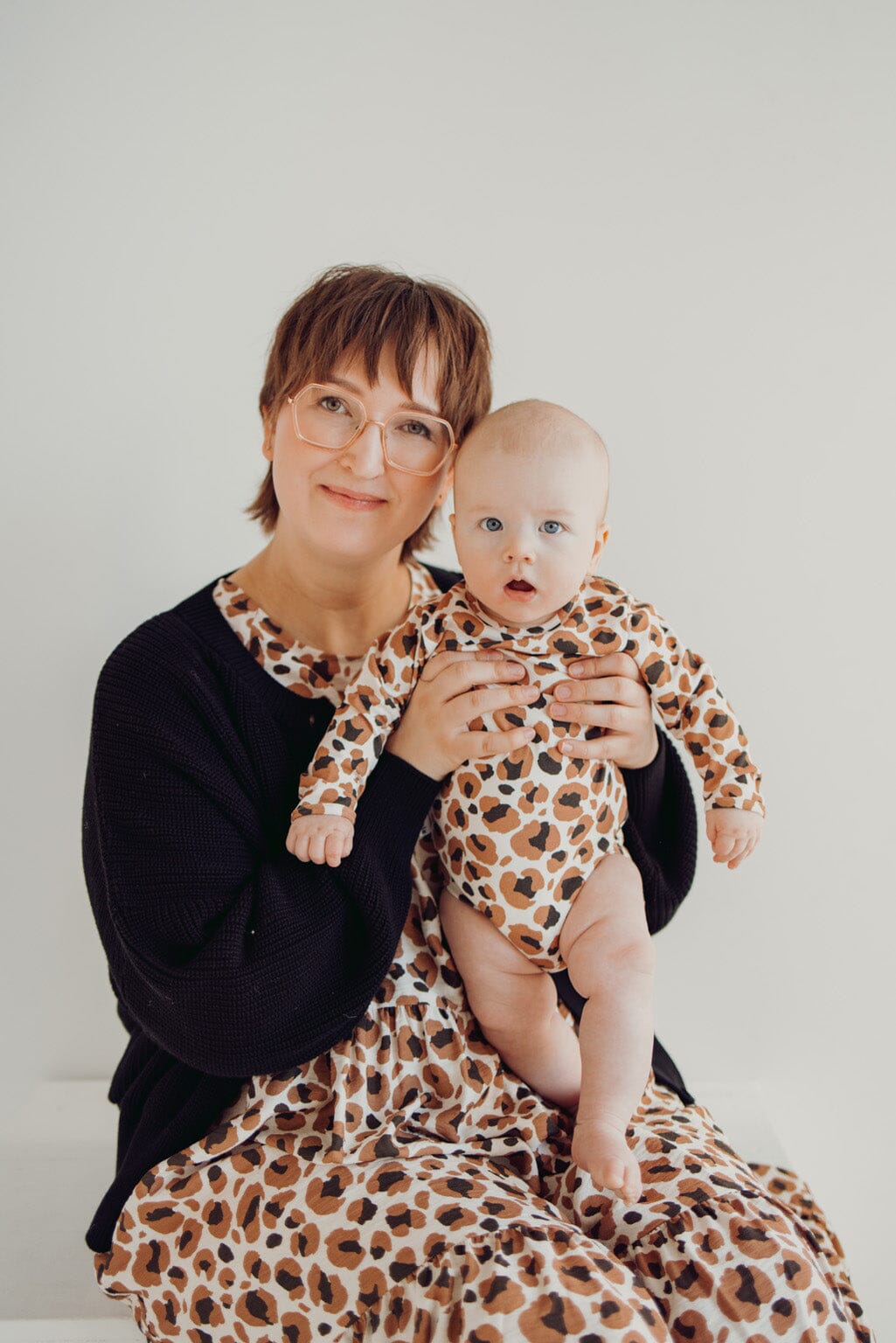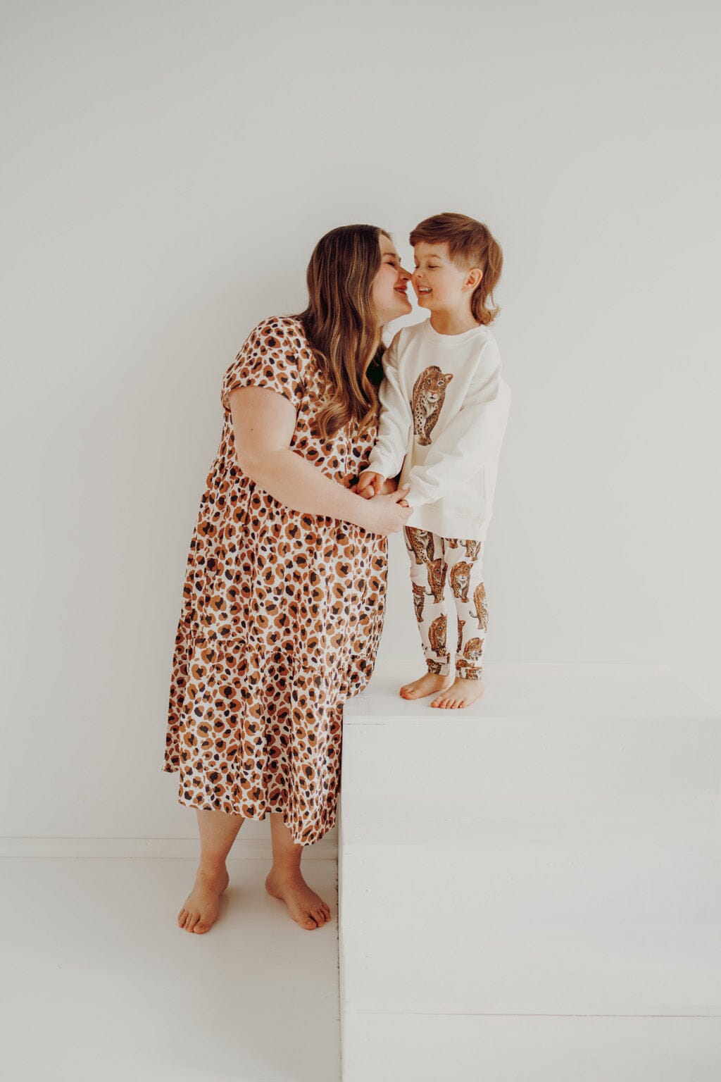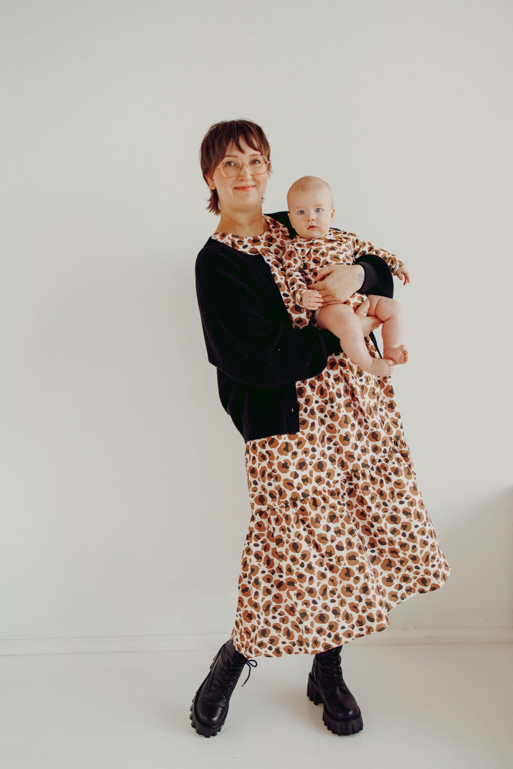 Mekon midi-pituus, lyhyet hihat ja näyttävä kerroksellinen helma luovat ilmavan ja elegantin kokonaisuuden, joka liikkuu kevyesti mukana. Ajaton ja trendikäs Leopold-kuosi tuo asuun modernia ilmettä ja tekee mekosta helposti yhdisteltävän niin arkeen kuin juhlaan.