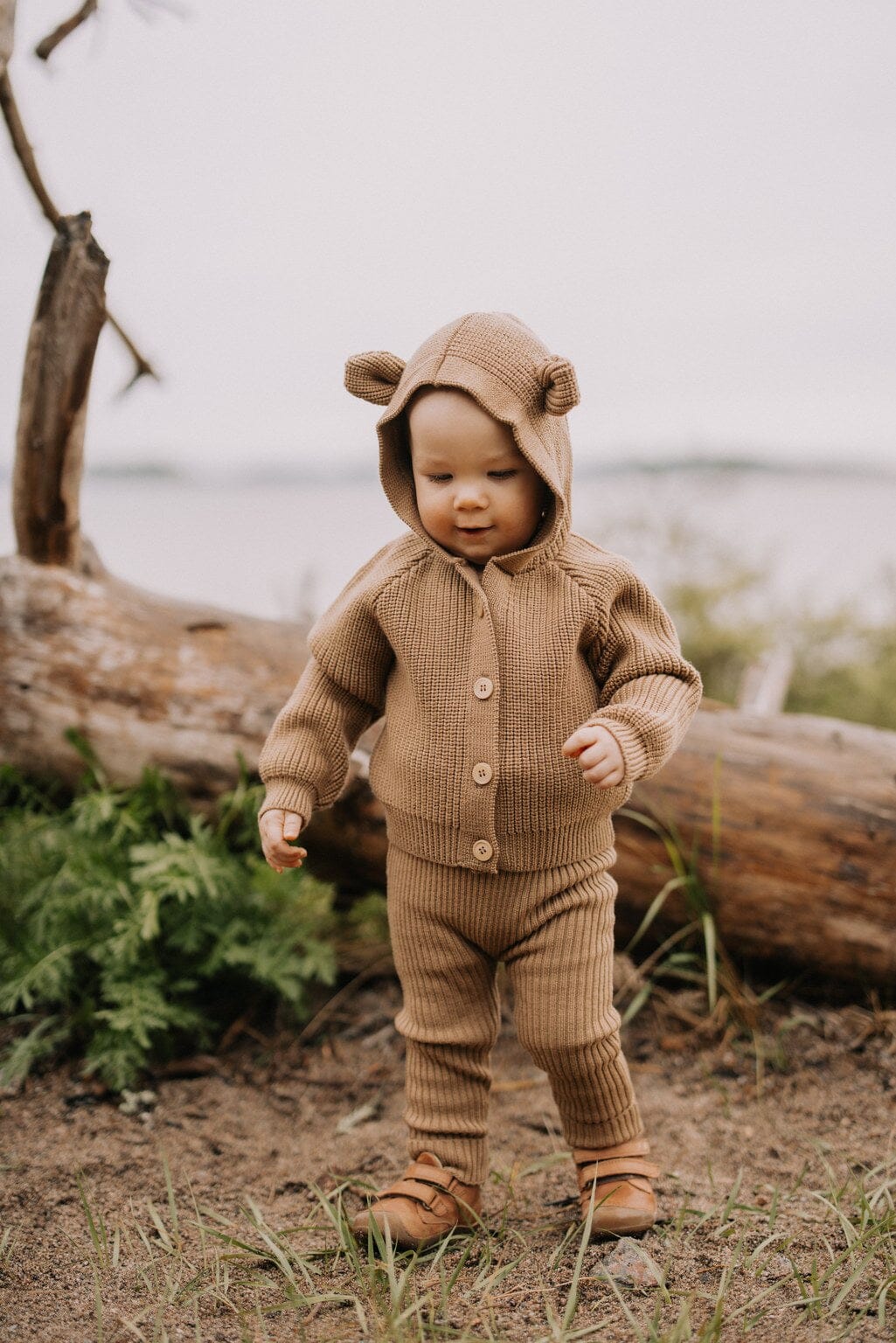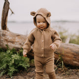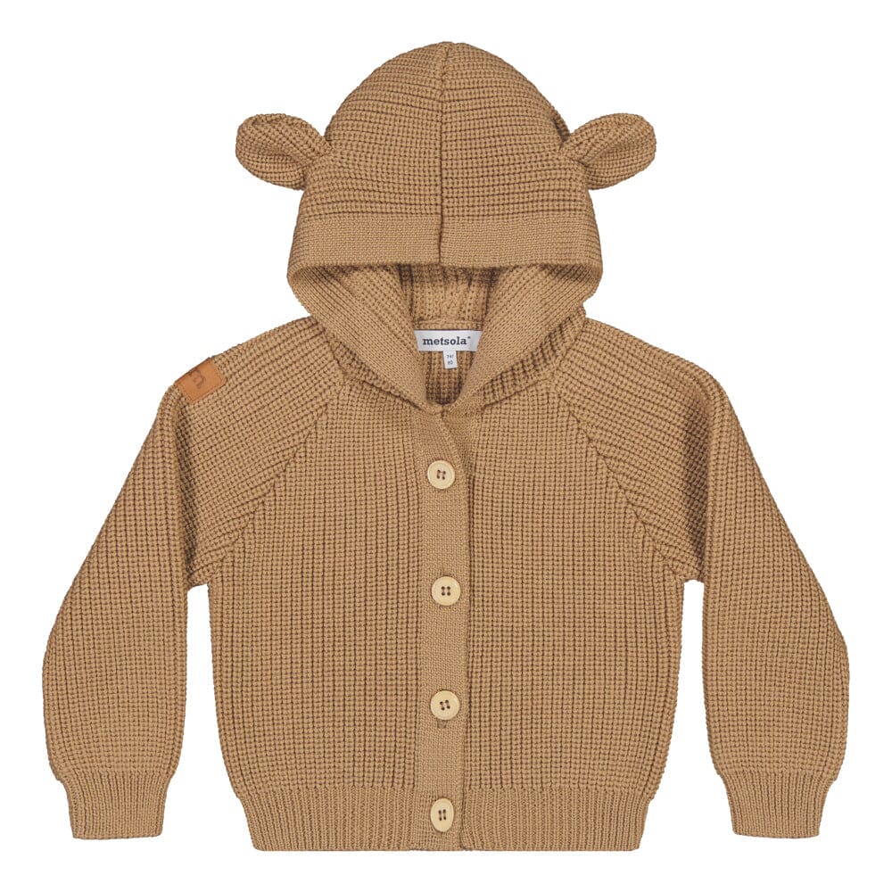 Woody-sävyinen lasten neuletakki on pehmeä, vastuullinen ja monikäyttöinen valinta viileisiin päiviin.