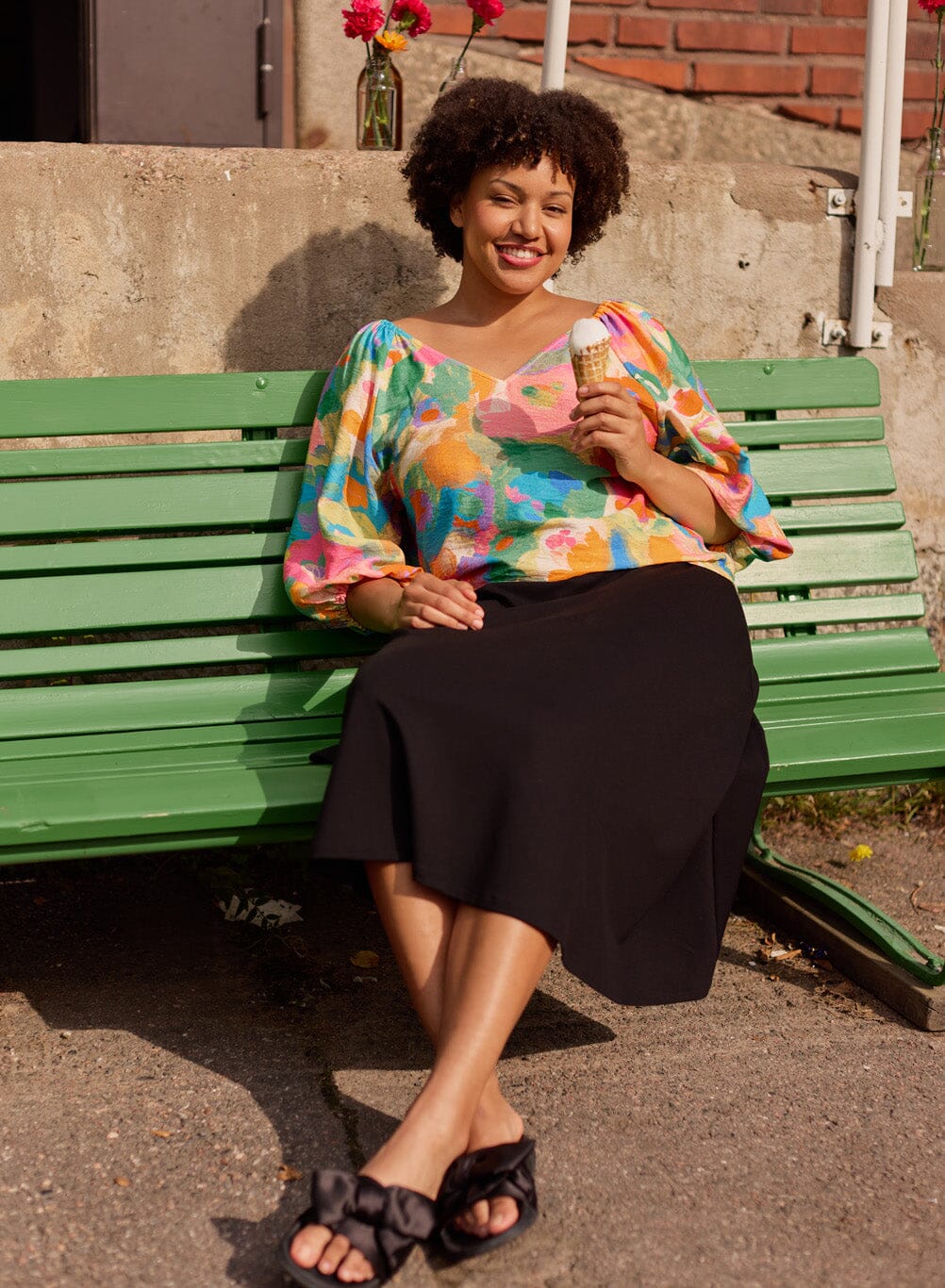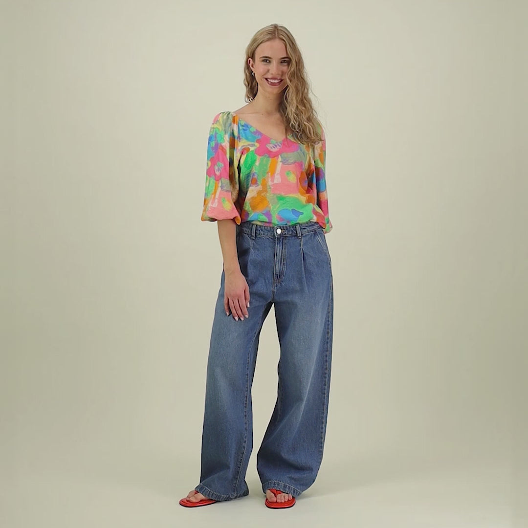 Volyymihihat luovat pehmeän, modernin ilmeen, ja puseroa voi käyttää molemmin päin - toisella puolella hieman syvempi V-aukko. Olkapäiden ripustusnauhat viimeistelevät käytännöllisyyden. Täydellinen pari niin hameille kuin housuille.