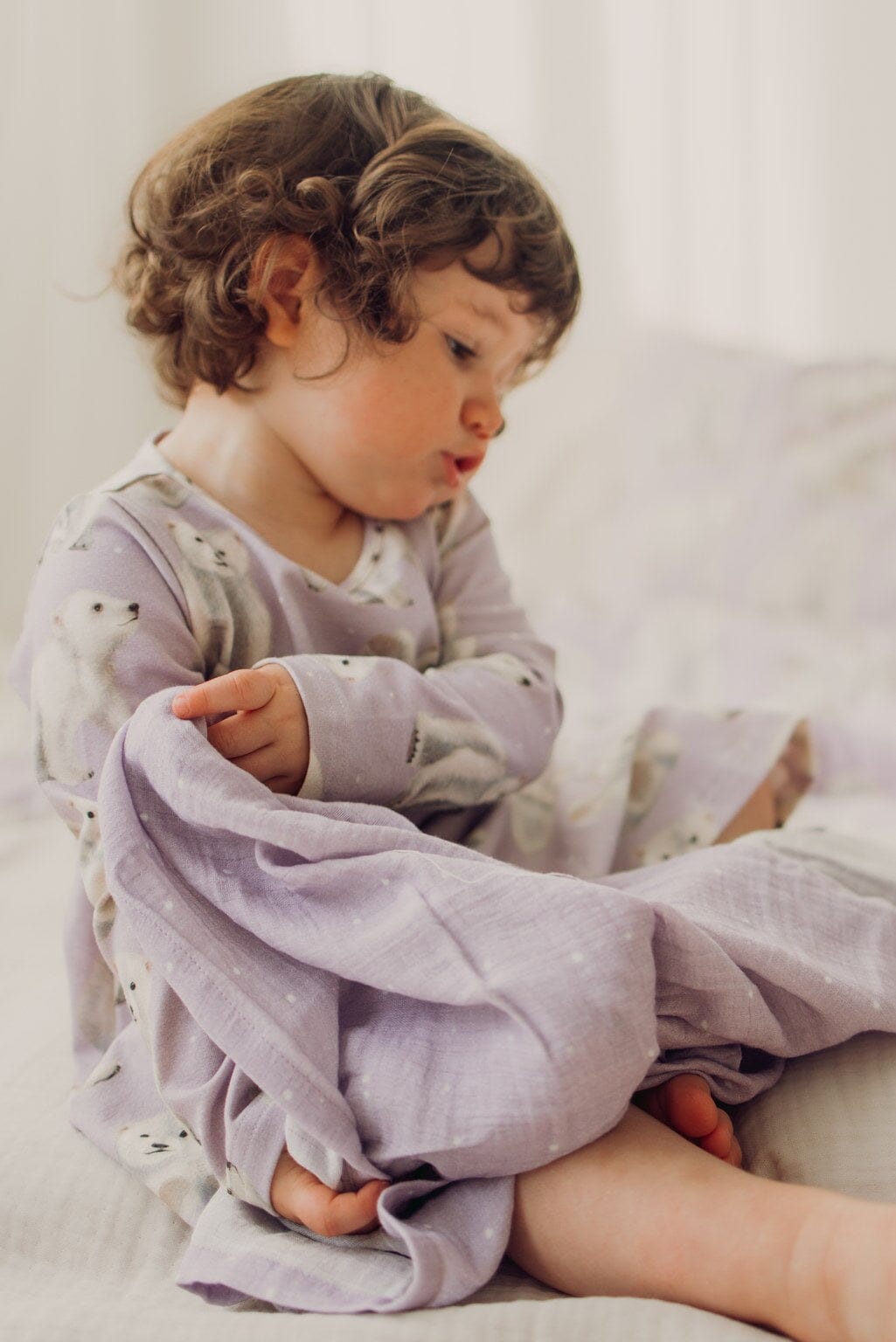 Polar Bears -Harsoliinasetti väri Icy Lilac sisältää kaksi ihanan pehmeää harsoa, jotka on valmistettu kevyestä ja hengittävästä luomupuuvillasta. Settiin kuuluu yksi harso Henna Adelin rakastetulla Polar Bears -kuosilla, sekä toinen harso herkillä lumihiutalekuvioilla.