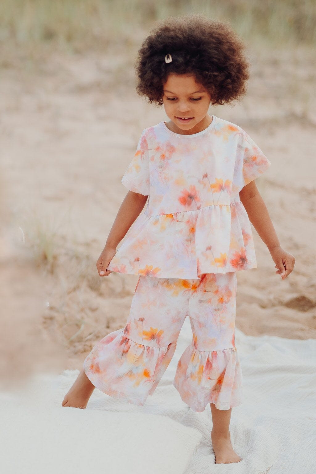 Uutuus, joka hurmaa ensi silmäyksellä! Pastel Dance Ruffle -housut ovat uudenlainen tulkinta lasten trikoohousuista – täynnä mukavuutta ja tyylikästä ilmettä. Housut on valmistettu pehmeästä ja joustavasta luomupuuvillatrikoosta, joka tuntuu miellyttävältä ihoa vasten ja liikkuu lapsen mukana leikeissä ja seikkailuissa.