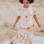 Rento kuminauhavyötärö takaa hyvän istuvuuden, ja housujen erikoisuus löytyy lahkeista: näyttävät röyhelöt lahkeensuissa tuovat ripauksen leikkisyyttä ja persoonallista tyyliä. Herkkä ja abstrakti Pastel Dance -kuosi viimeistelee kokonaisuuden taianomaisella tunnelmalla.