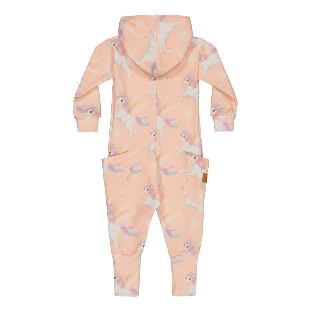 Henna Adelin kuvittaman Pastel Pony -kuosin vauvojen ja lasten collegehaalari on valmistettu luomupuuvillasta ja sen sisäpinta on harjattua collegea. Haalarissa on käytännöllinen vetoketjusuljenta. Jumpsuit on suunniteltu erittäin pitkäikäiseksi, sillä reilunmittaiset resorit ja lahkeensuussa pidentävät käyttöikää merkittävästi.