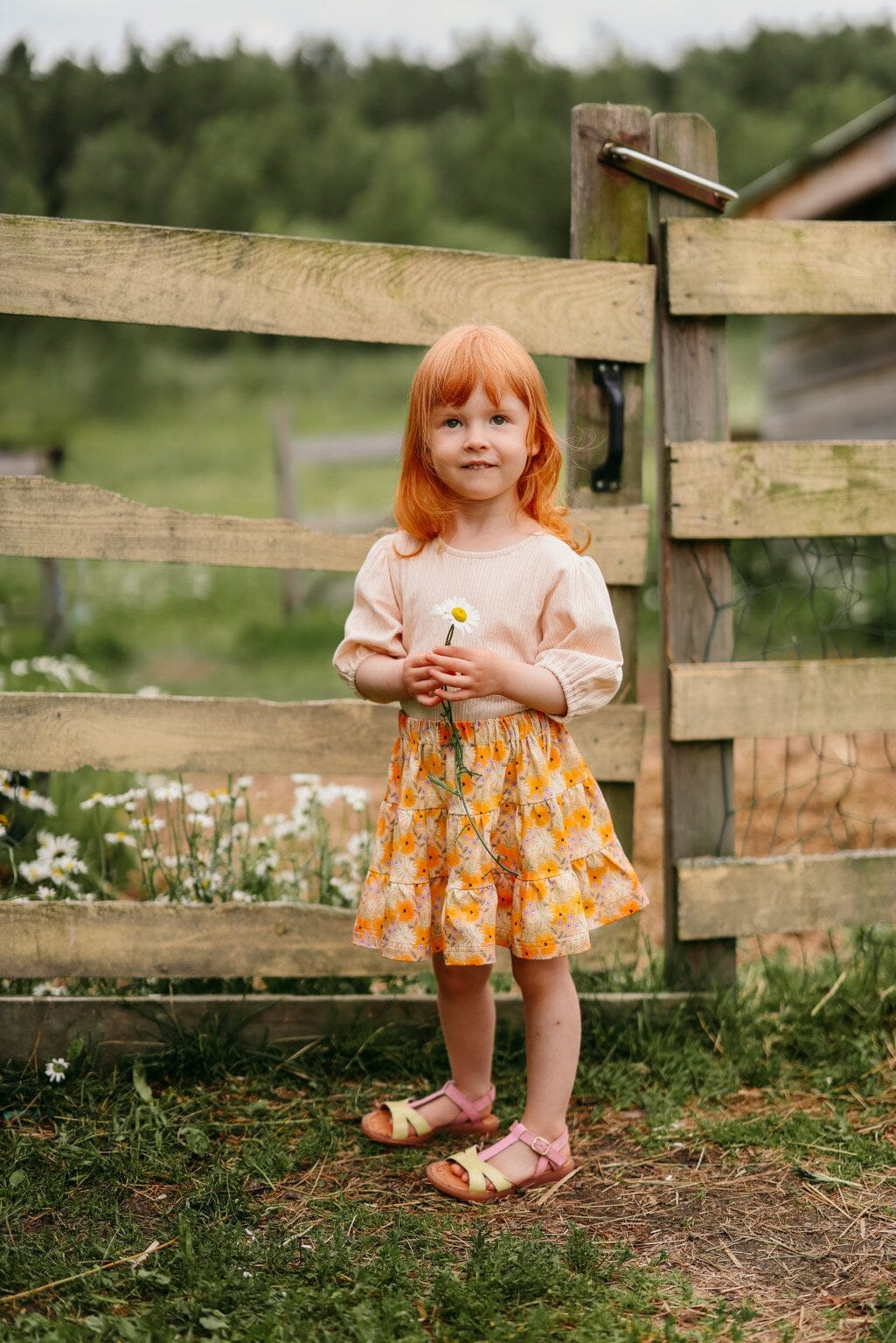 Kuvan malli on 97cm pitkä ja hänen yllään on koko 98/104. Kokotaulukon mitat ovat suuntaa antavia. Mitat ovat +/- 1cm tarkkuudella.