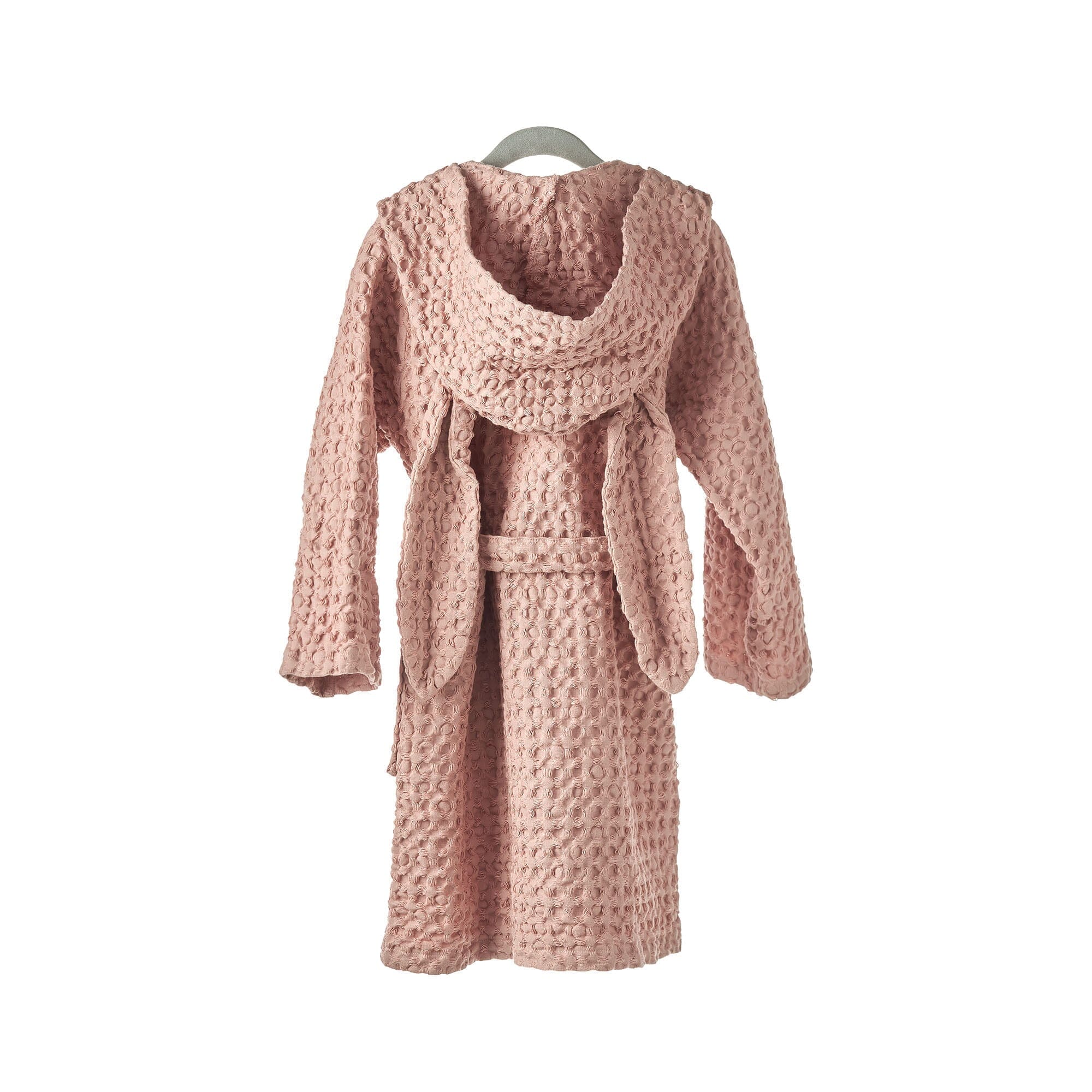 Suloista vaaleanpunaista lasten kylpytakkia koristaa huppu, jossa on pitkät pupunkorvat. Pupu-kylpytakki on pestystä luomupuuvillaisesta vohvelikankaasta valmistettu ja se on kevyen ja mukavan tuntuinen ihoa vasten.