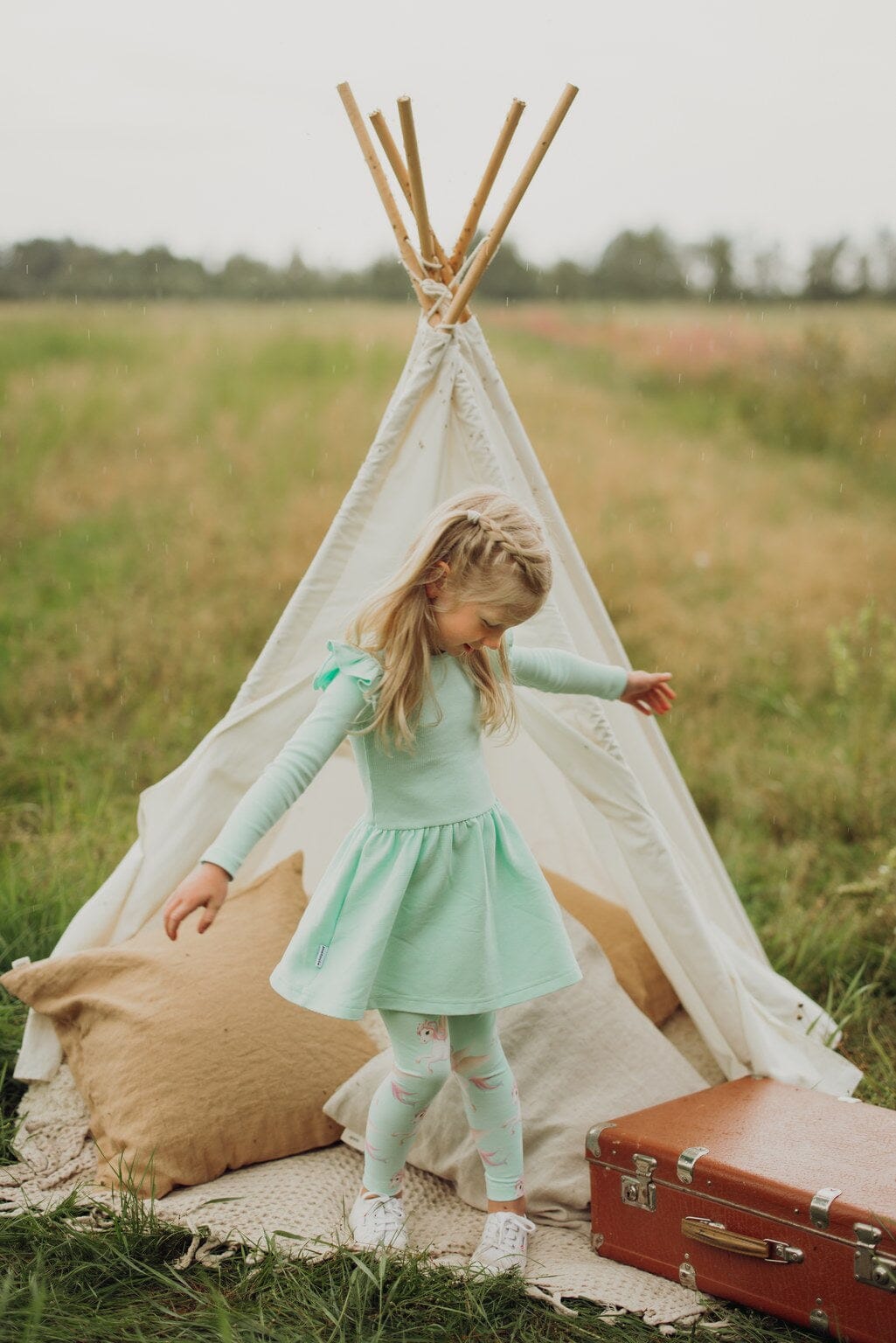 Mekko on valmistettu pehmeästä ja joustavasta luomupuuvillaisesta ribbineuloksesta, joka tuntuu mukavalta ihoa vasten ja mahdollistaa vapaan liikkumisen. Frillayksityiskohdat olkapäillä tuovat ilmeeseen keveyttä ja ripauksen juhlavuutta, joka sopii myös arjen seikkailuihin.