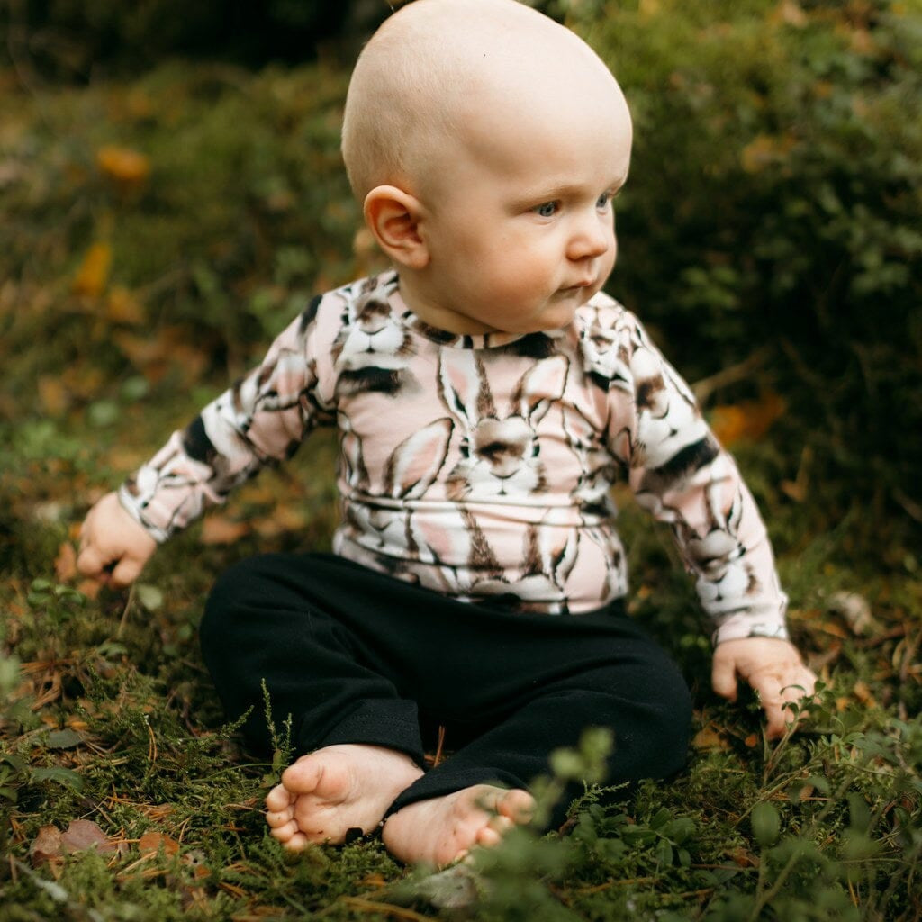 Yksivärisiä rib tuotteita löytyy klassikko mallistostamme kolmessa sävyssä; Black, Peony sekä Muddy boots. Black sävyssä on saatavilla henkseli leggingsit, paita ja leggingsit.