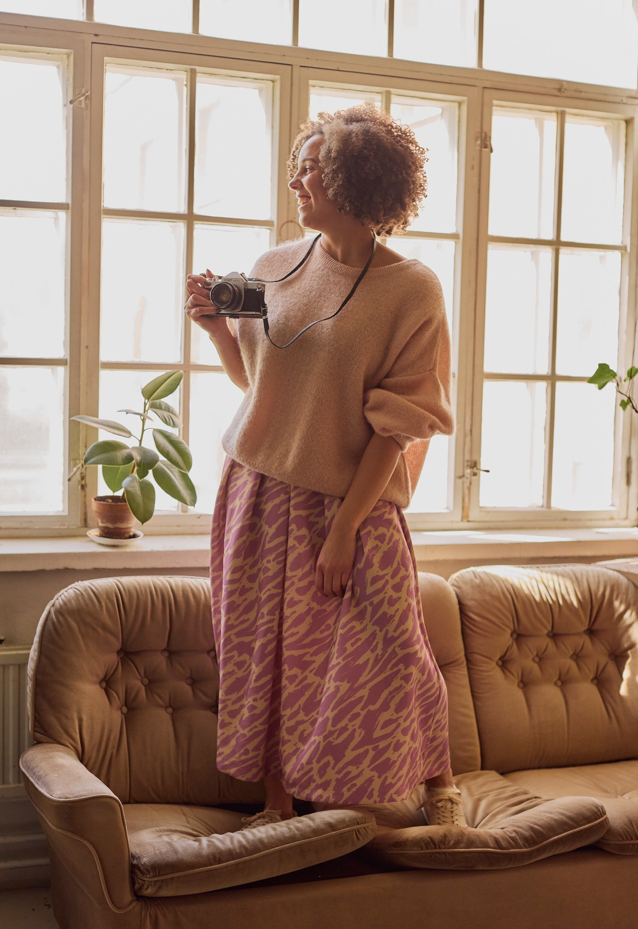 Hame on valmistettu osaksi kierrätetystä polyesterista. Hieman paksumpi kangas tekee vaikutuksen – se tuntuu ylelliseltä päällä, pysyy kauniina ja sileänä käytössä ja säilyttää ryhtinsä päivän mittaan. Elegantti Purple-väri hehkuu kauden sävyissä, ja monikäyttöinen midimitta sopii täydellisesti niin arkeen kuin juhlavampiin hetkiin.
