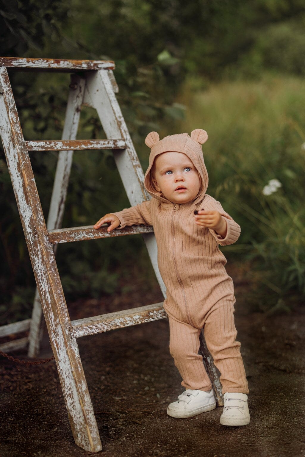 Haalarin hupussa on söpöt nallenkorvat ja takana pieni töpöhäntä - yksityiskohdat, jotka tekevät tästä asusta lapsen ja vanhempien yhteisen suosikin. Materiaalina toimii uutuus wide rib - puuvillapohjainen, joustava ja hyvin muotonsa pitävä leveäribbinen neulos, joka näyttää ryhdikkäältä ja tuntuu miellyttävältä ihoa vasten.
